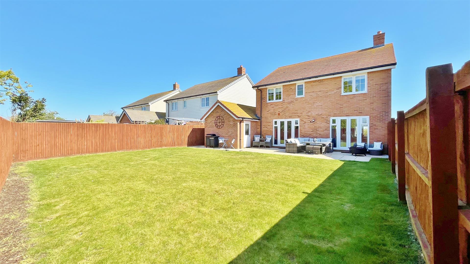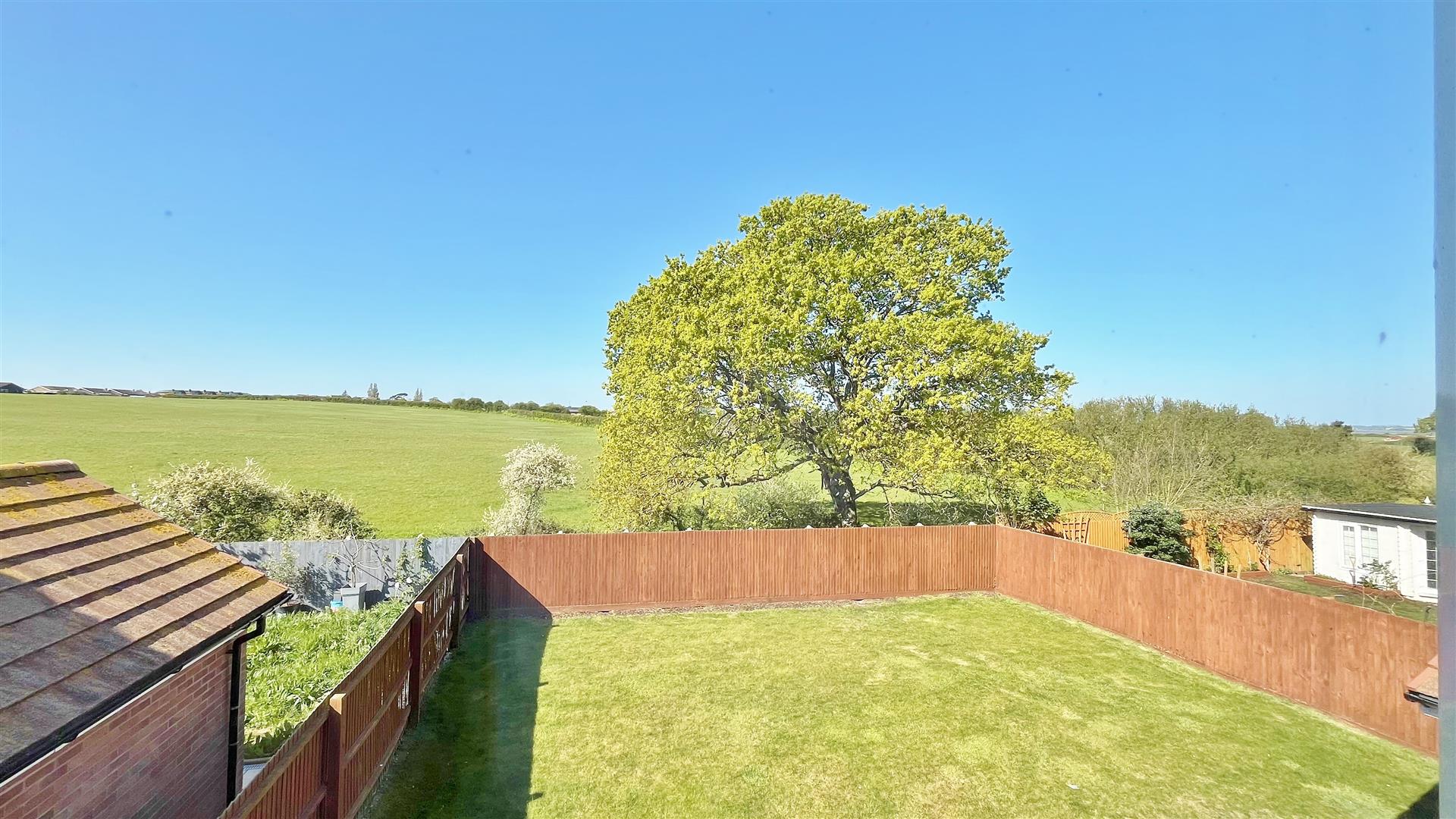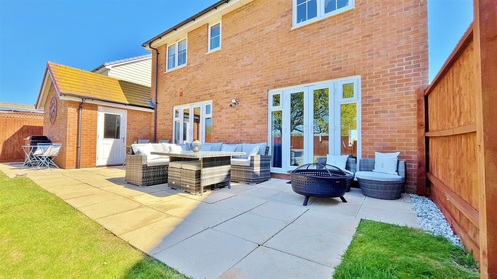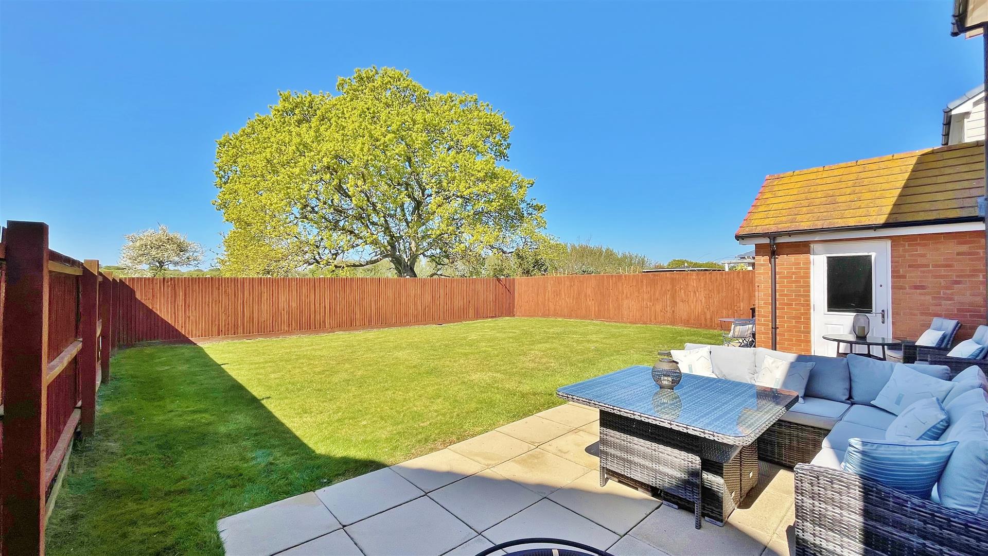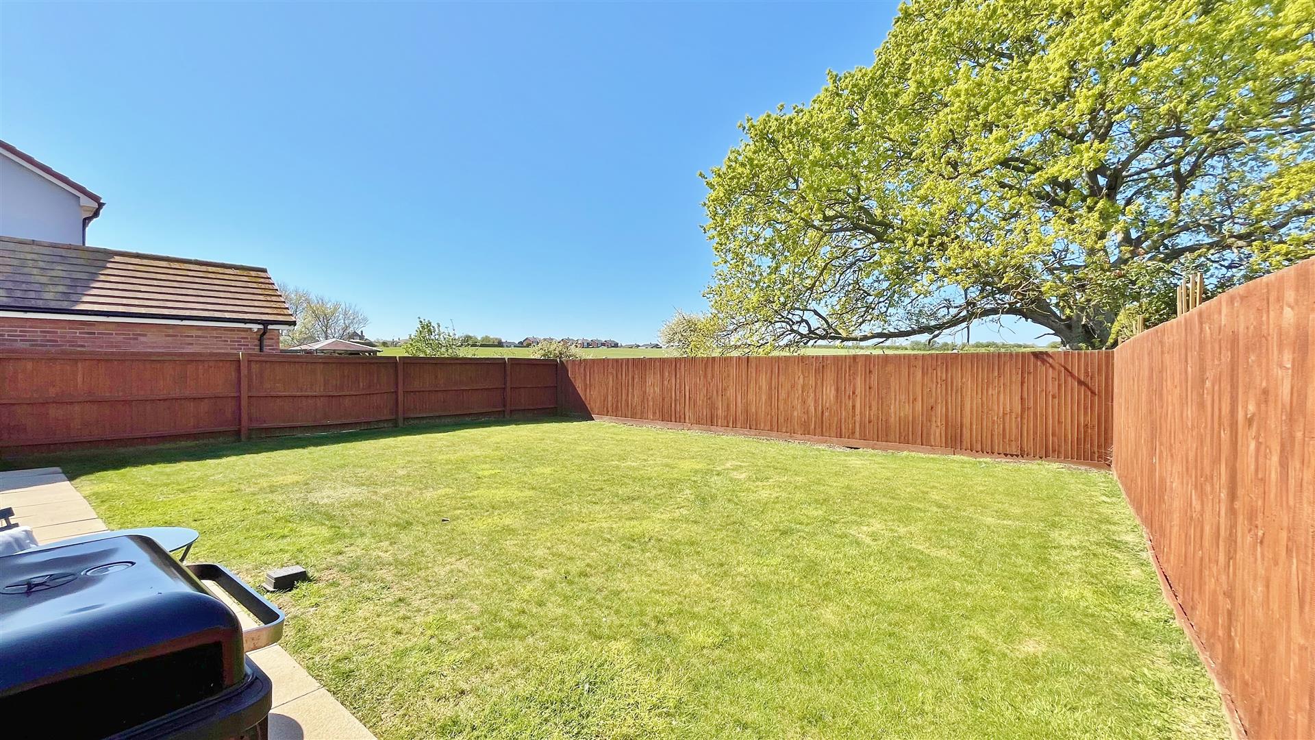 Part paved patio area. Remainder laid to lawn. Private access door to garage. Access to front via side gate. Un-overlooked. South west facing.