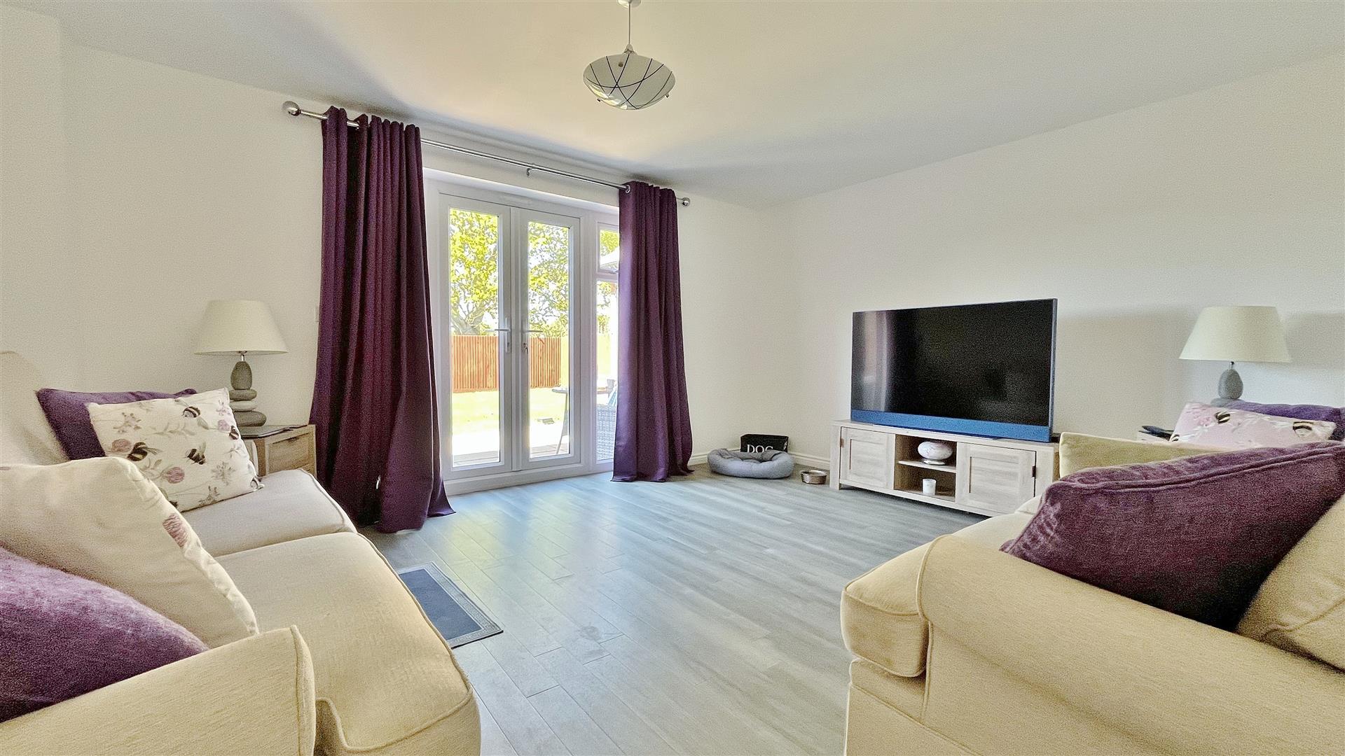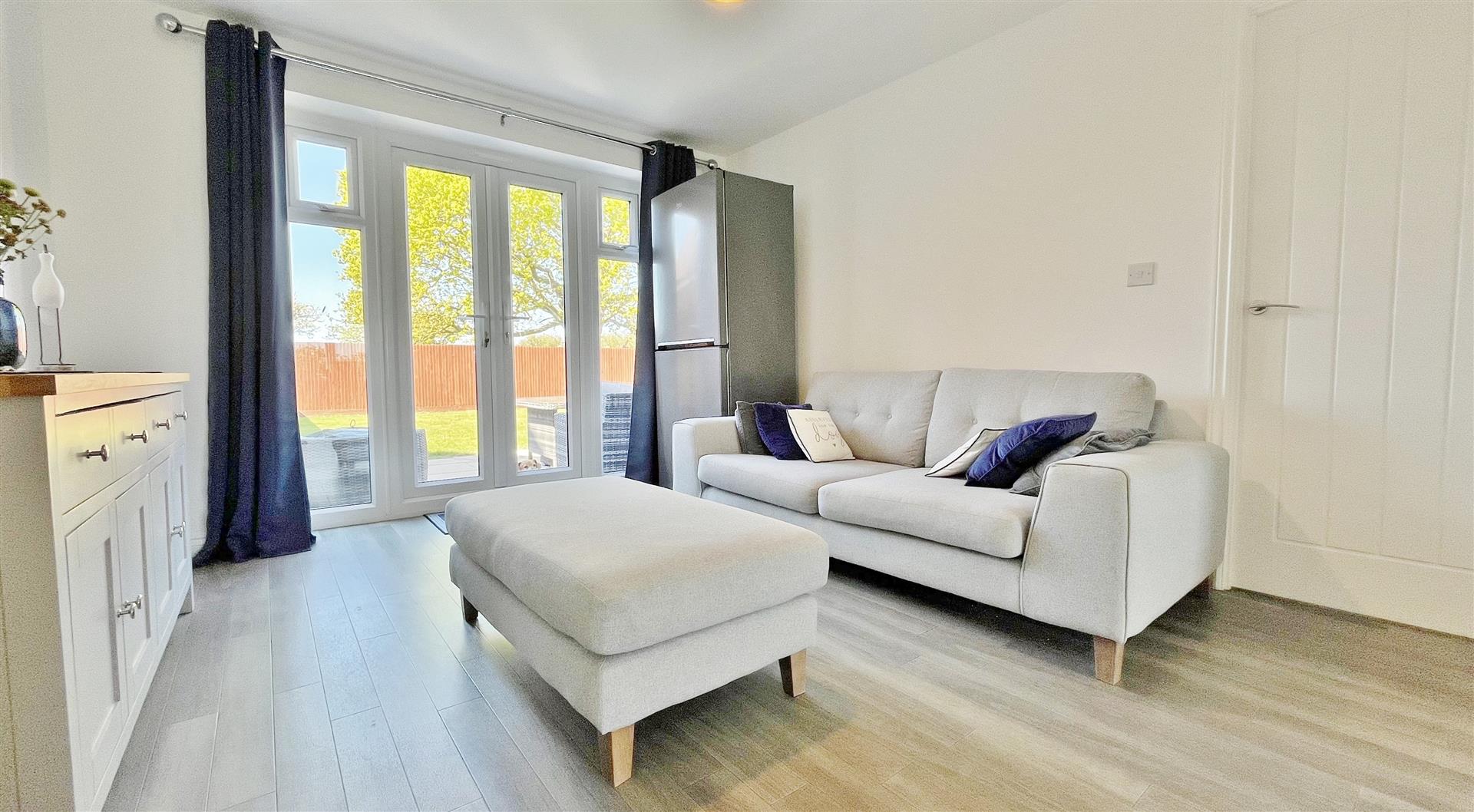 Radiator. Wood effect laminate flooring. Sealed unit double glazed patio doors to garden.