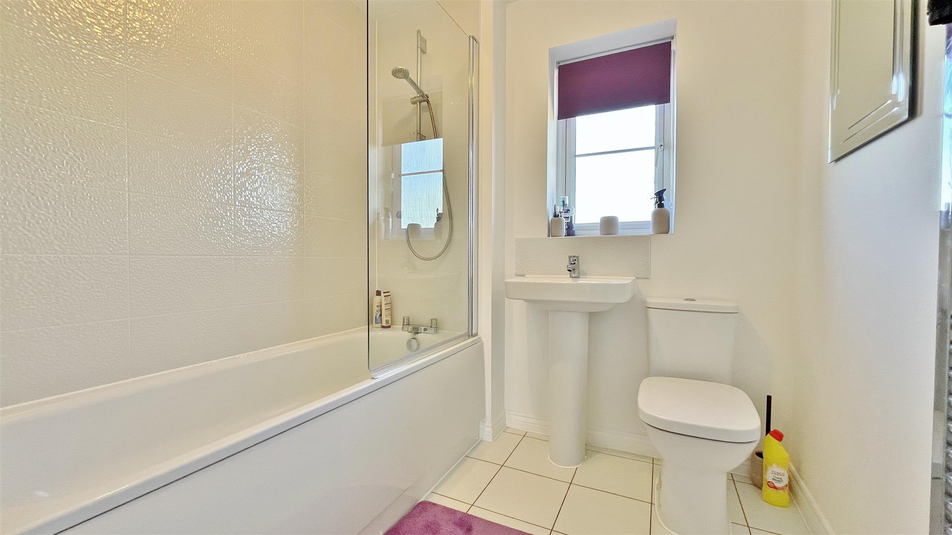 White suite comprises of low level w/c. Pedestal hand wash basin. Fitted panelled bath with wall mounted shower attachment. Heated towel rail. Extractor fan. Part tiled walls. Tiled flooring. Obscured sealed unit double glazed window to rear.