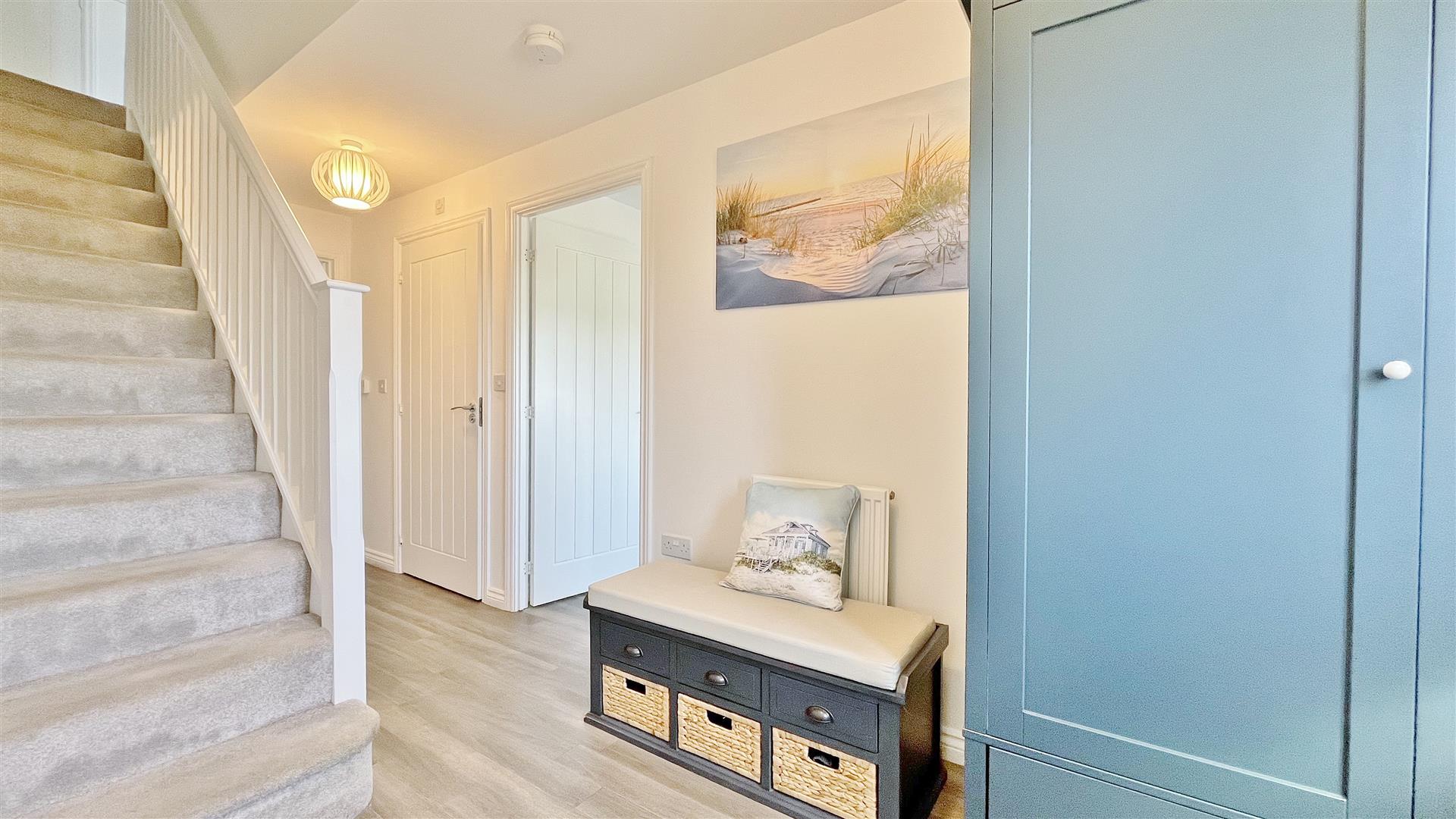 Radiator. Wood effect laminate flooring. Under-stair storage cupboard. Stair flight to first floor. Doors to:-