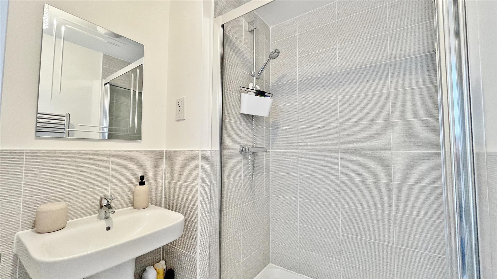 Modern suite comprises of low level w/c. Pedestal hand wash basin. Fitted shower cubicle with wall mounted shower attachment. Heated towel rail. Extractor fan. Part tiled walls. Tiled flooring.