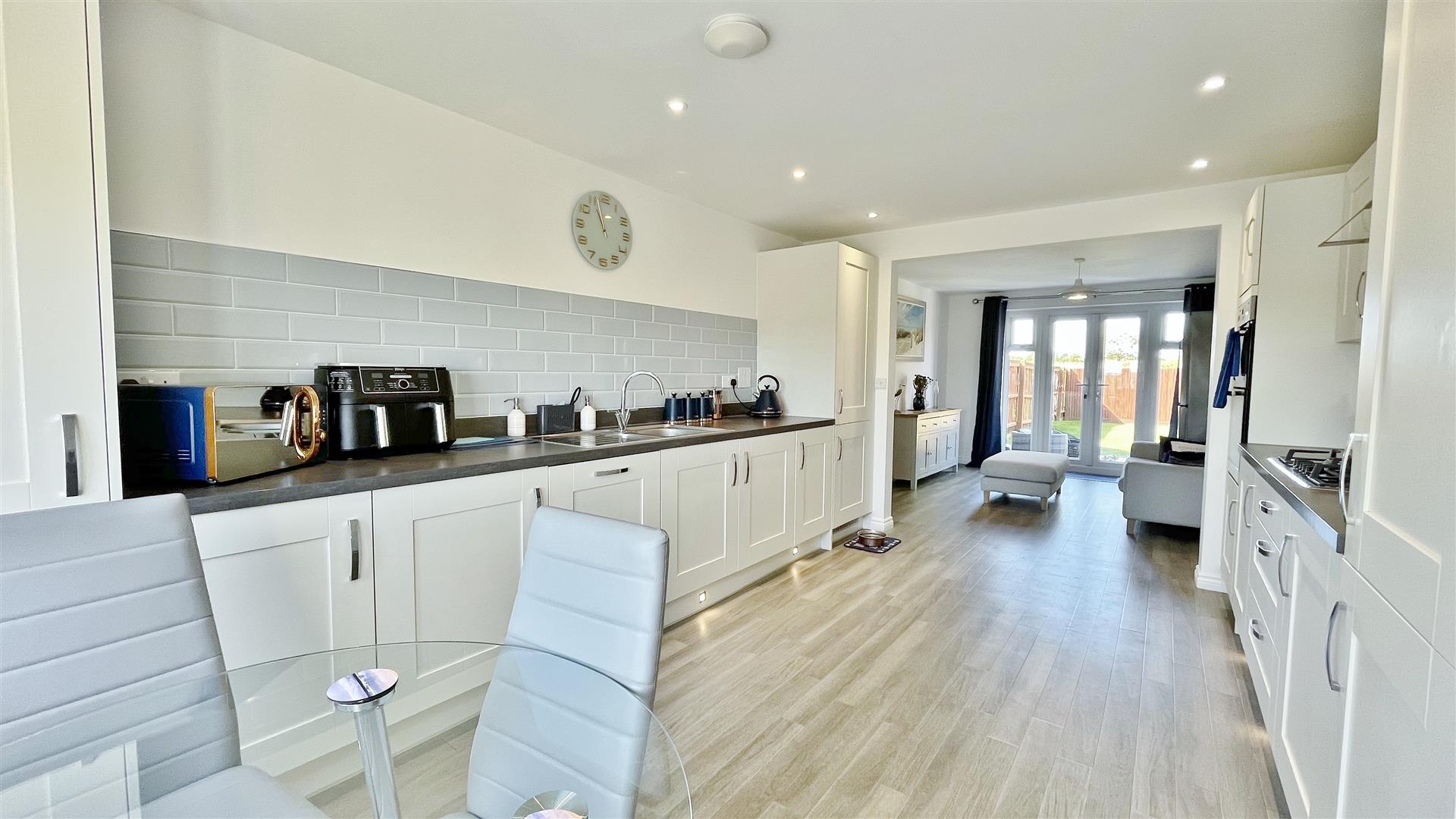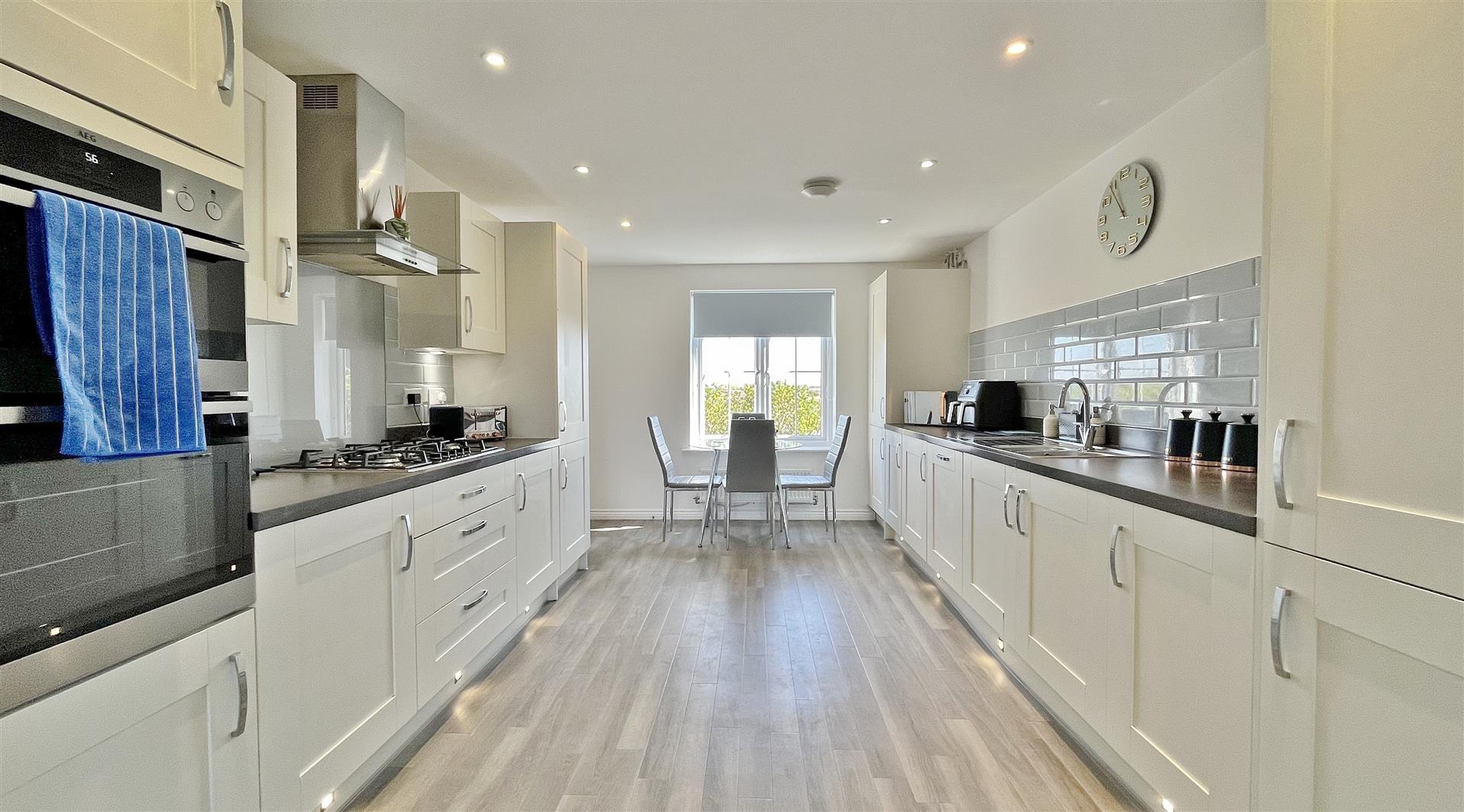 Fitted in a range of matching fronted units. Wood effect square edge work surfaces. Inset stainless steel one and a half sink bowl and drainer unit. Inset five ring gas hob with extractor hood above. Built in eye level electric oven. Further range of matching fronted units both eye and floor level. Integrated fridge/freezer & dishwasher. Tiled splash back. Wood effect laminate flooring. Radiator. Spotlights. Sealed unit double glazed window to front. Opening to:-