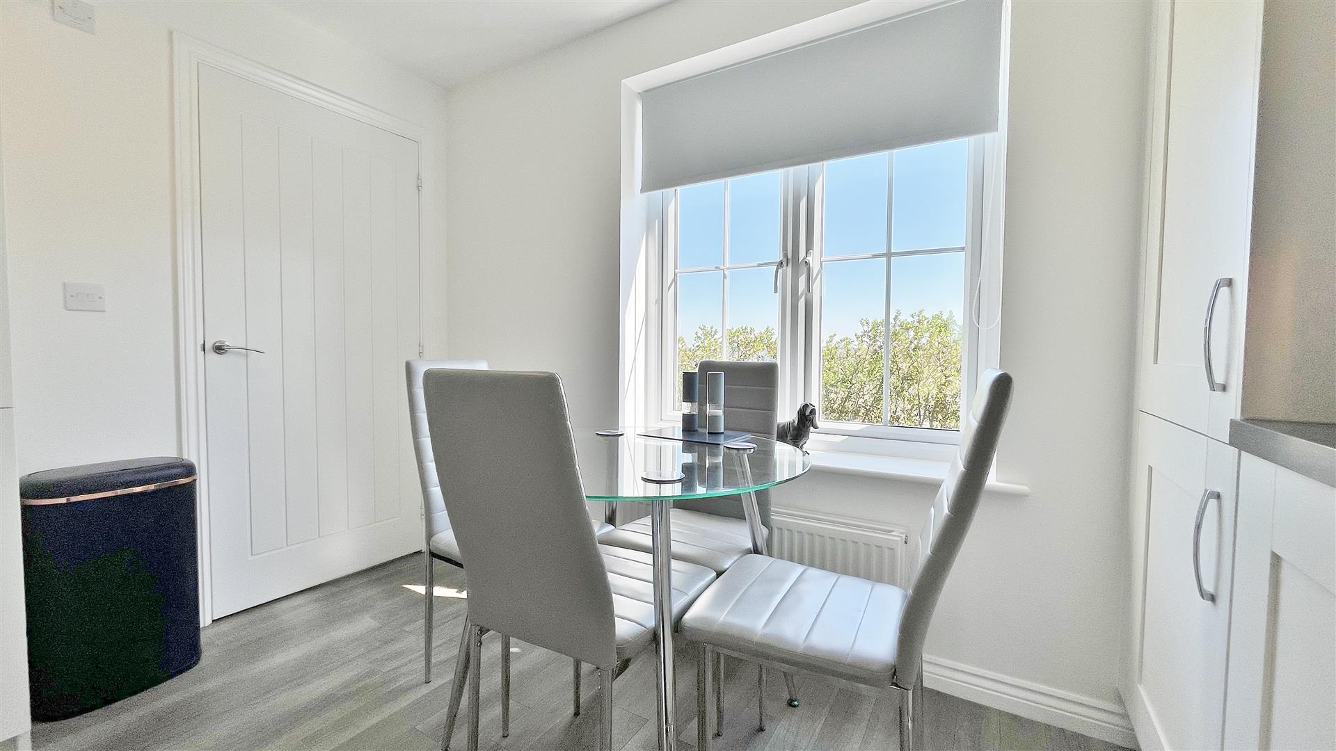 Suite comprises of low level w/c. Vanity hand was basin. Fitted storage cupboards with square edge work surfaces. Integrated washing machine. Heated towel rail. Wood effect laminate flooring. Extractor fan.