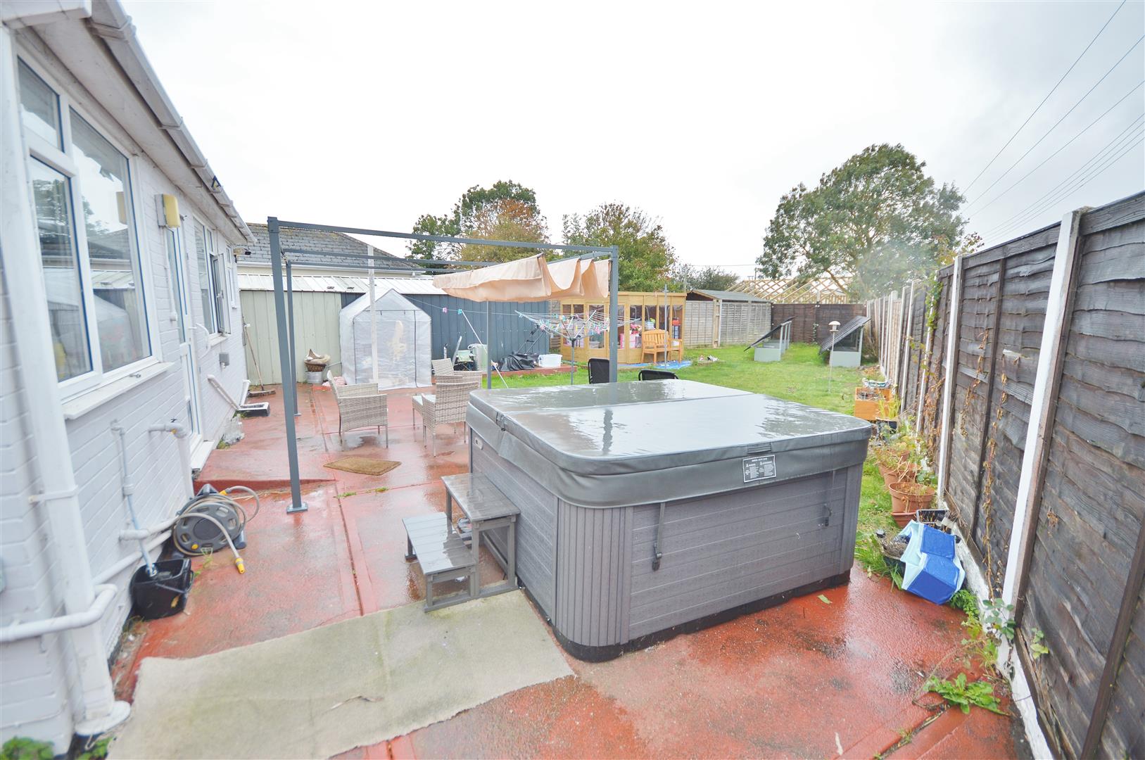 Concrete paved area with remainder being laid to lawn. Metal storage shed. Enclosed by panelled fencing. Side pedestrian access leading to front. Solar Panels.