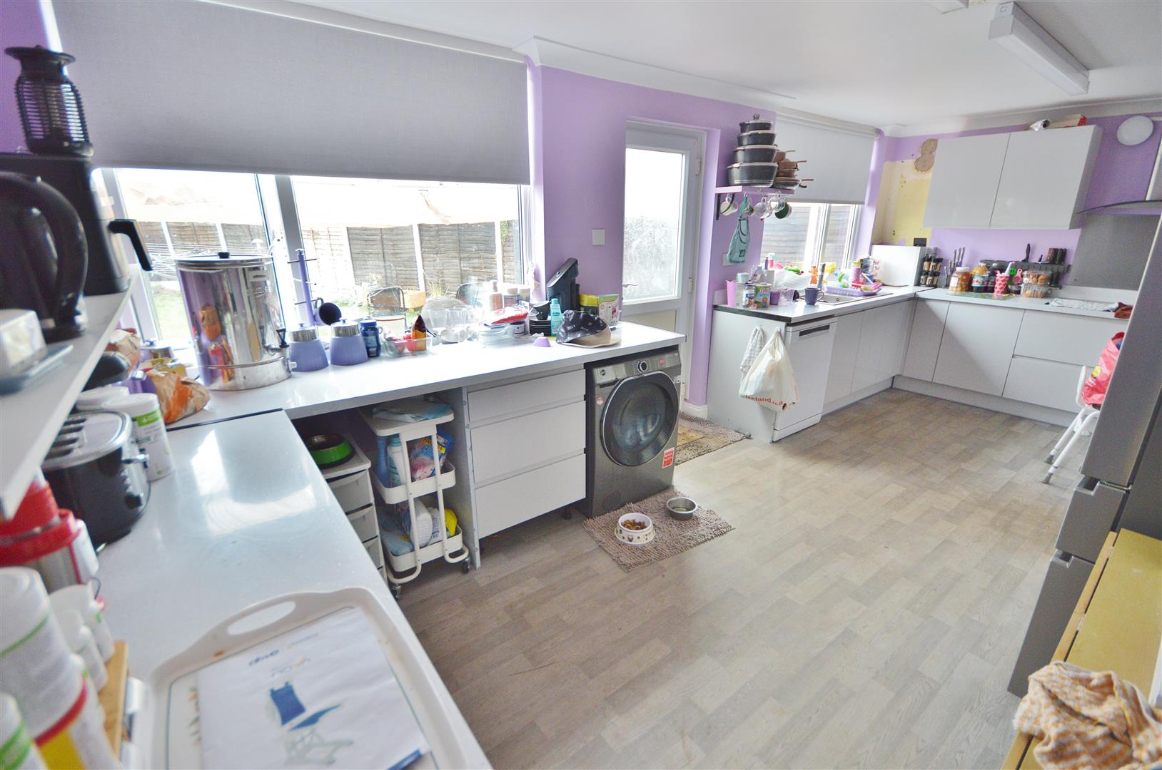 Fitted kitchen suite comprising; Laminated square edge work surfaces with inset five ring electric hob with extractor hood above. Inset oven with grill above. Appliances not tested. Inset single drainer stainless steel sink unit with stainless steel mixer tap. Wall mounted gas boiler (not tested). Selection of grey gloss fronted wall units with cupboards and drawers at both eye and floor level. Space and plumbing for washing machine and dishwasher. Radiator. Double glazed windows to rear. UPVC double glazed door leading to rear garden. Door to;