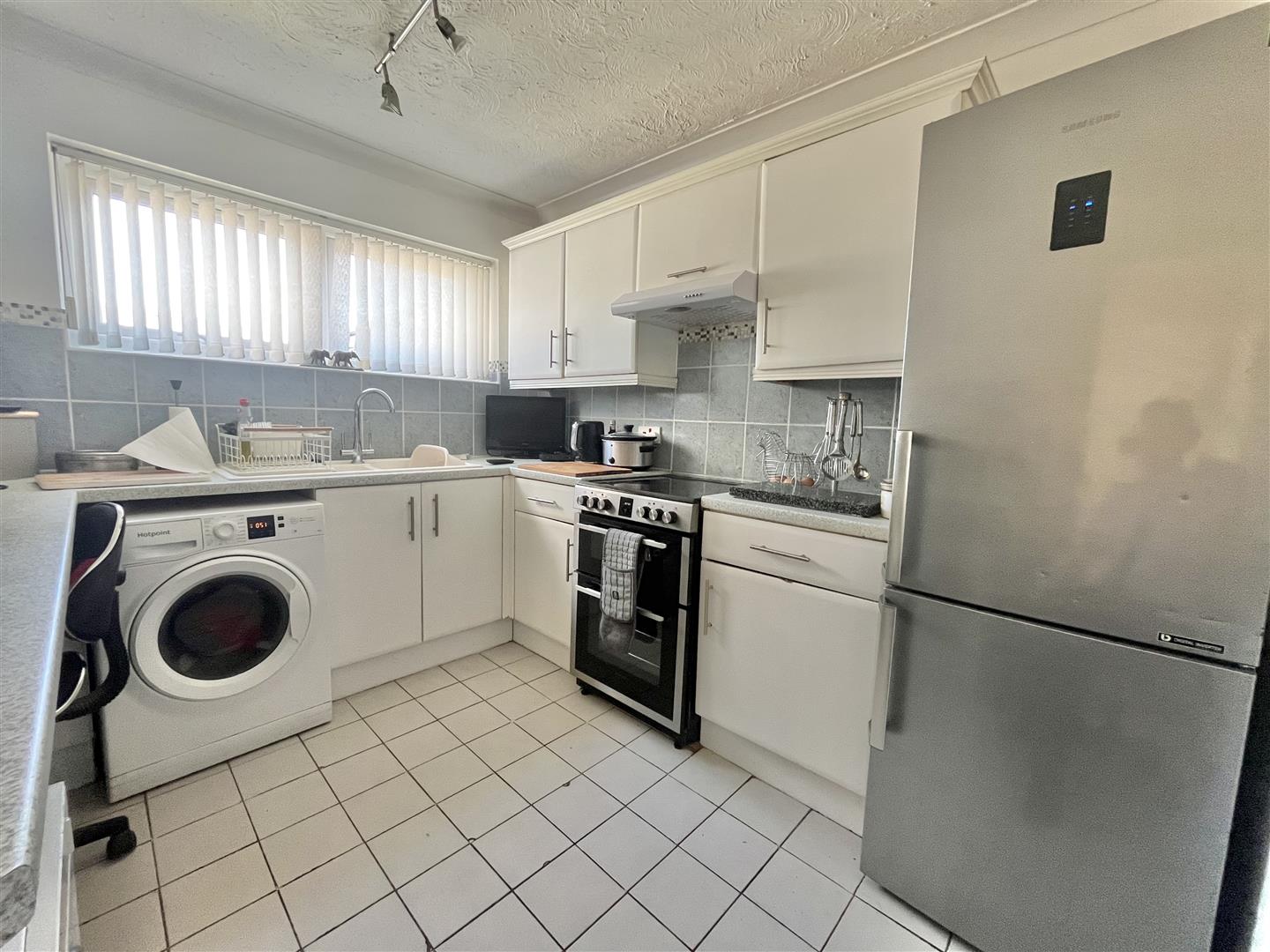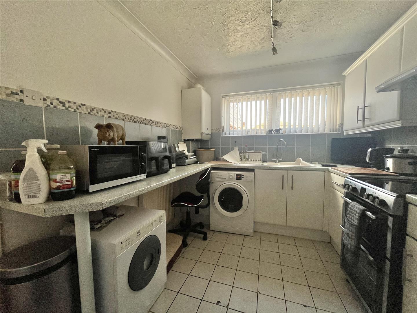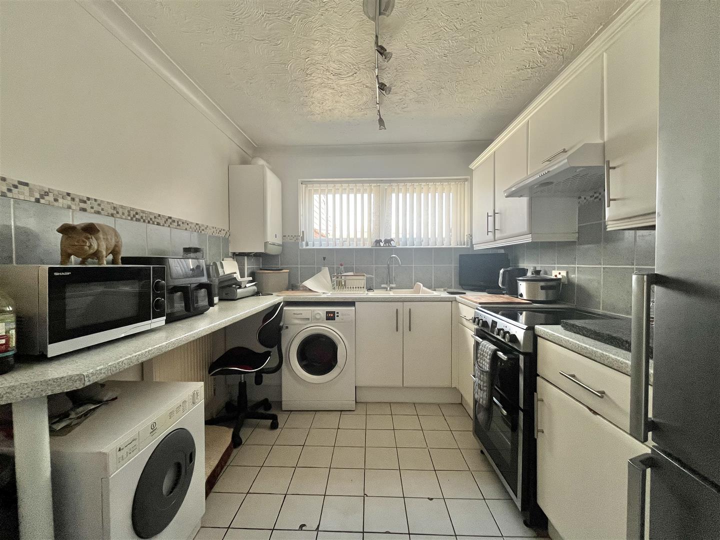 Fitted kitchen suite comprising granite effect square edge work surfaces with Crème wall mounted cabinets with cupboards and drawers below. Ceramic one and a half bowl drainer sink unit with stainless steel mixer tap. Gas combination boiler. Space for washing machine. Space for dryer. Space for cooker. Extractor hood (not tested). Space for fridge freezer. Space for dishwasher. Tiled splashbacks. Radiator. Double glazed window to rear.