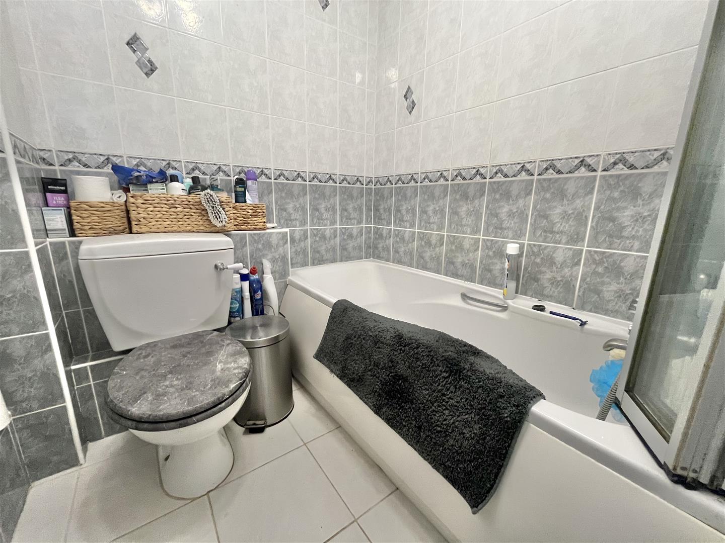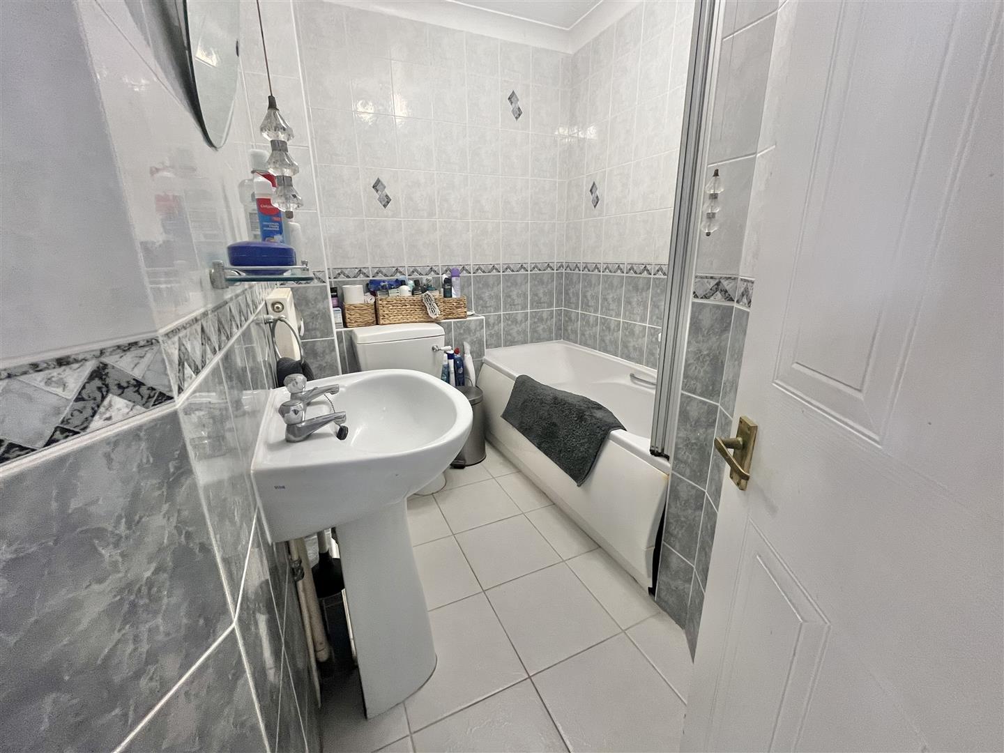 Three piece suite comprising low level W.C. Pedestal wash hand sink basin. White panelled bath with electric wall mounted shower above (not tested). Radiator.
