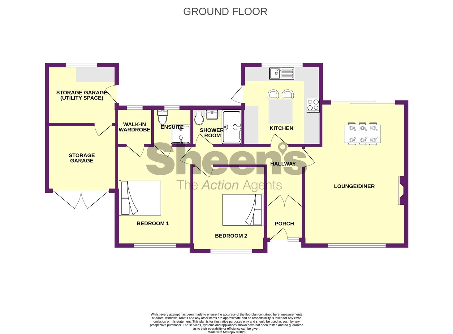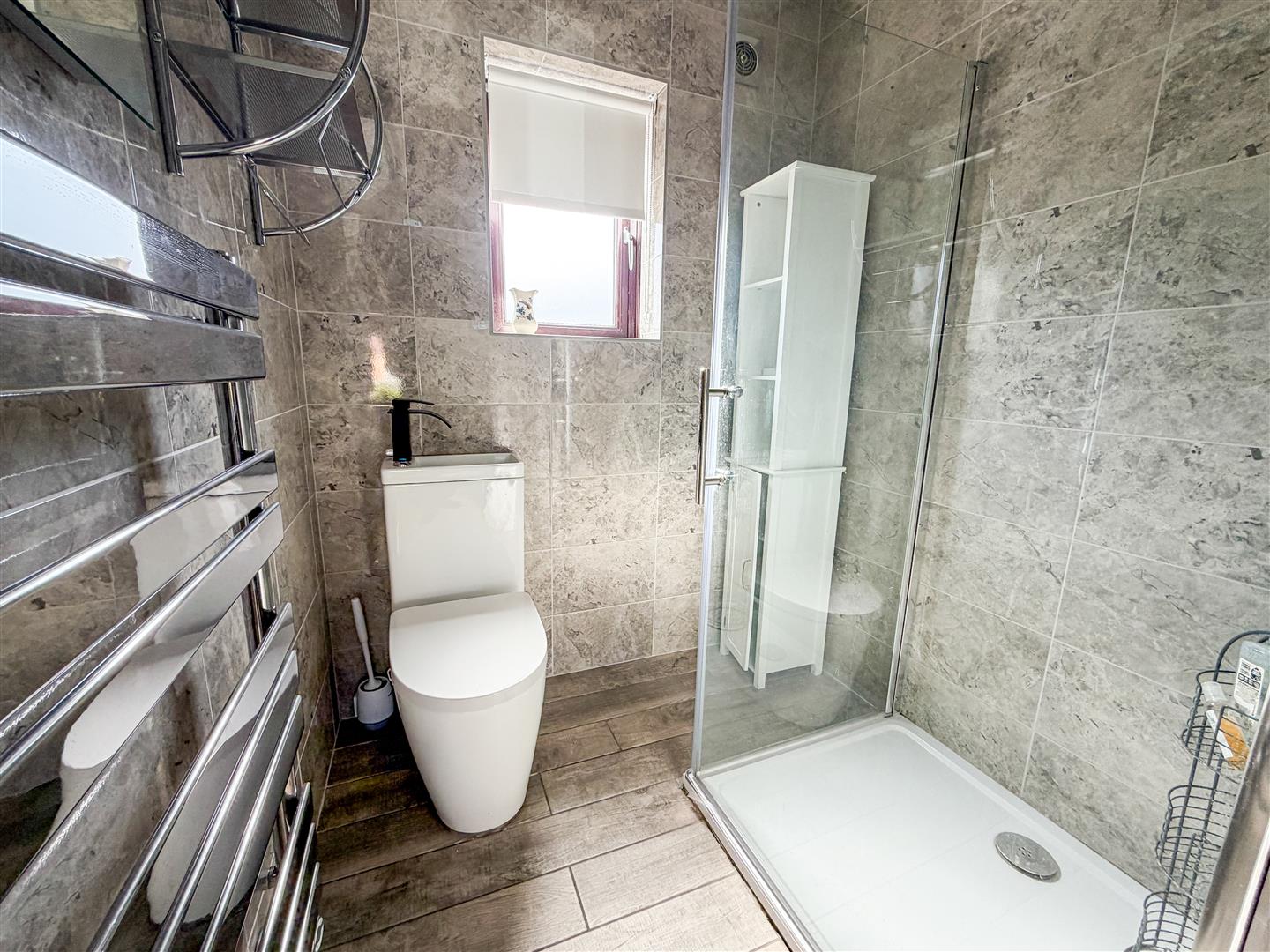 Fitted with a modern three-piece white suite. Comprises shower cubicle with integrated shower. Low level W.C with cistern top wash hand basin with mixer tap. Chrome effect heated towel rail. Fully tiled walls. Tiled flooring with under floor heating. Double glazed window to rear.