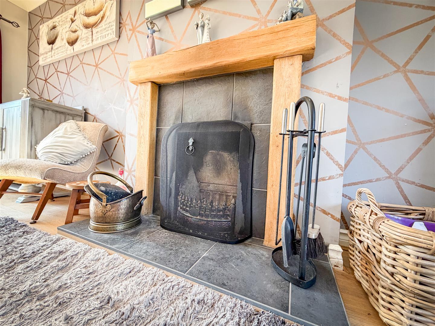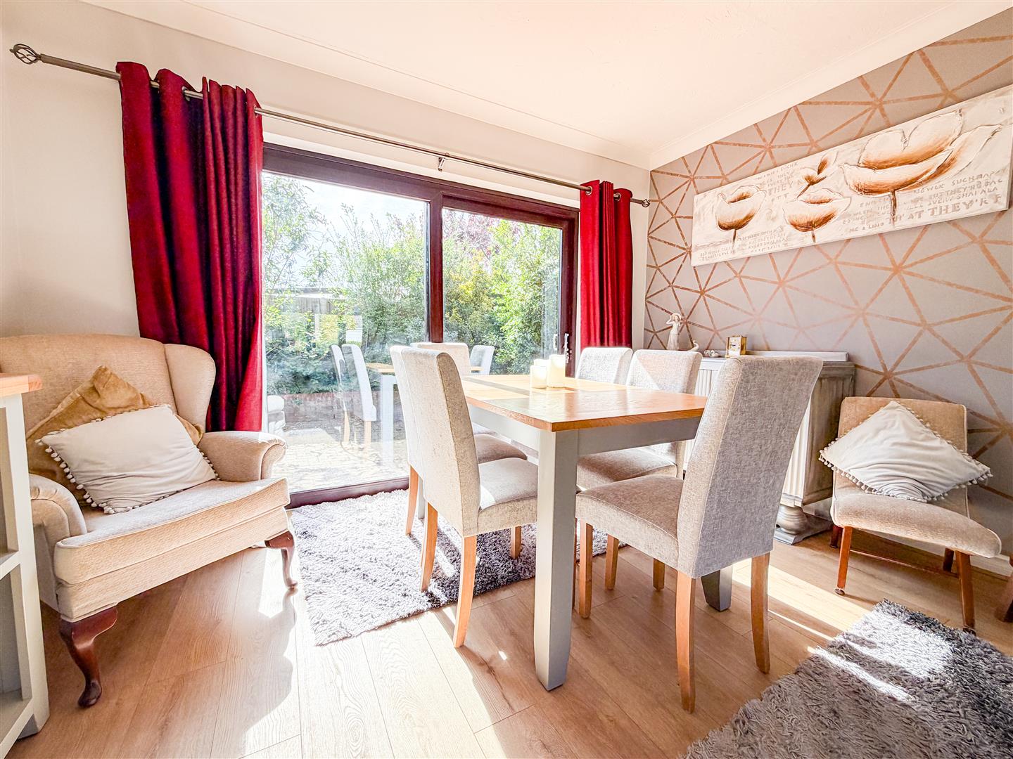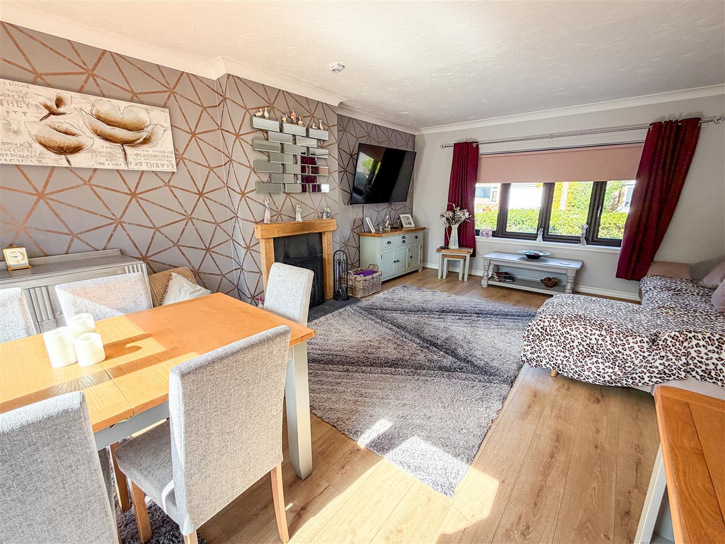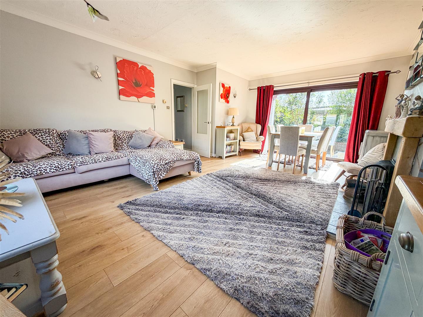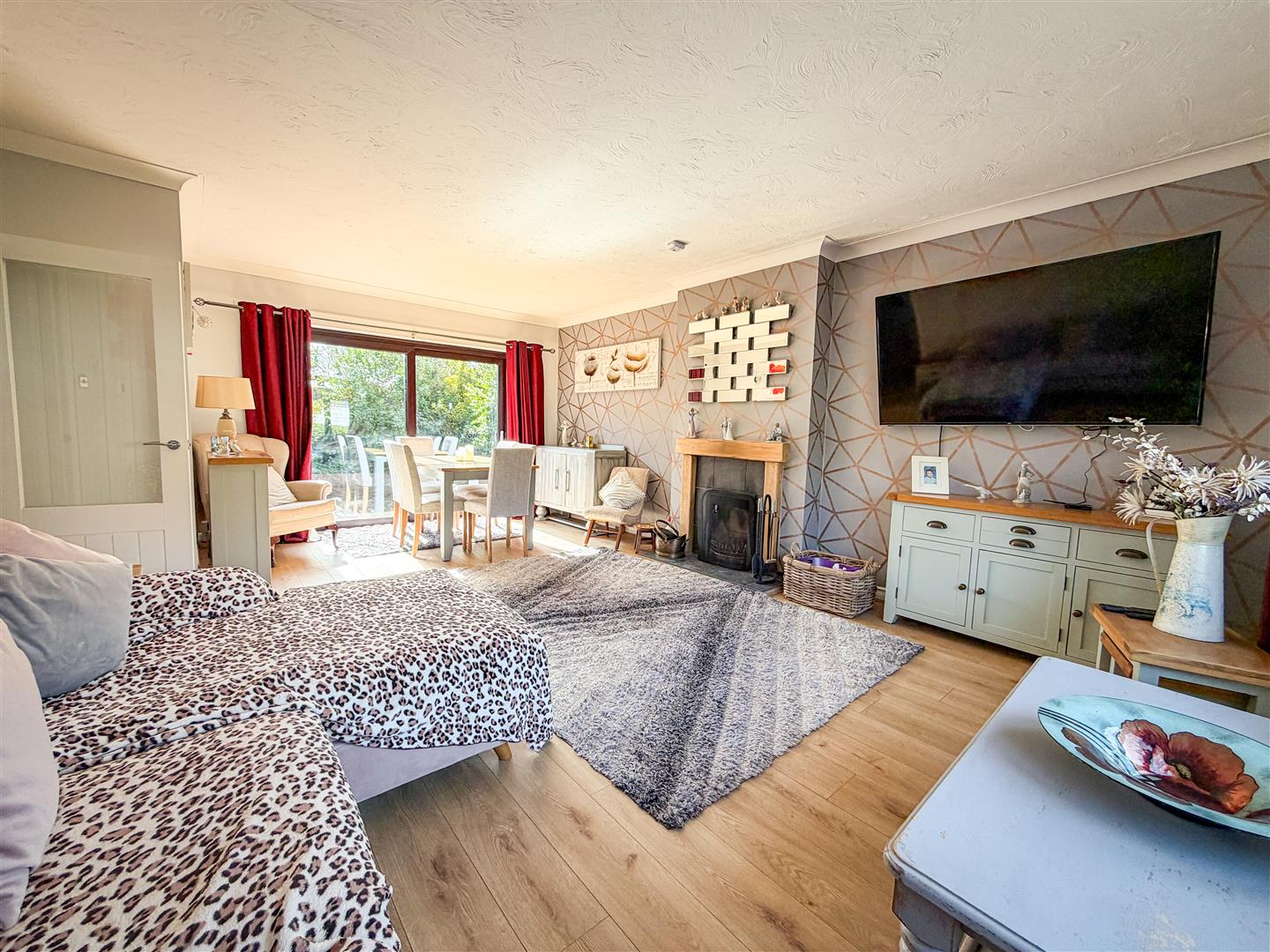 Feature open fireplace with tiled hearth and wooden surround. Wood effect flooring with underfloor heating. Double glazed window to front. Double glazed sliding patio doors to rear garden.