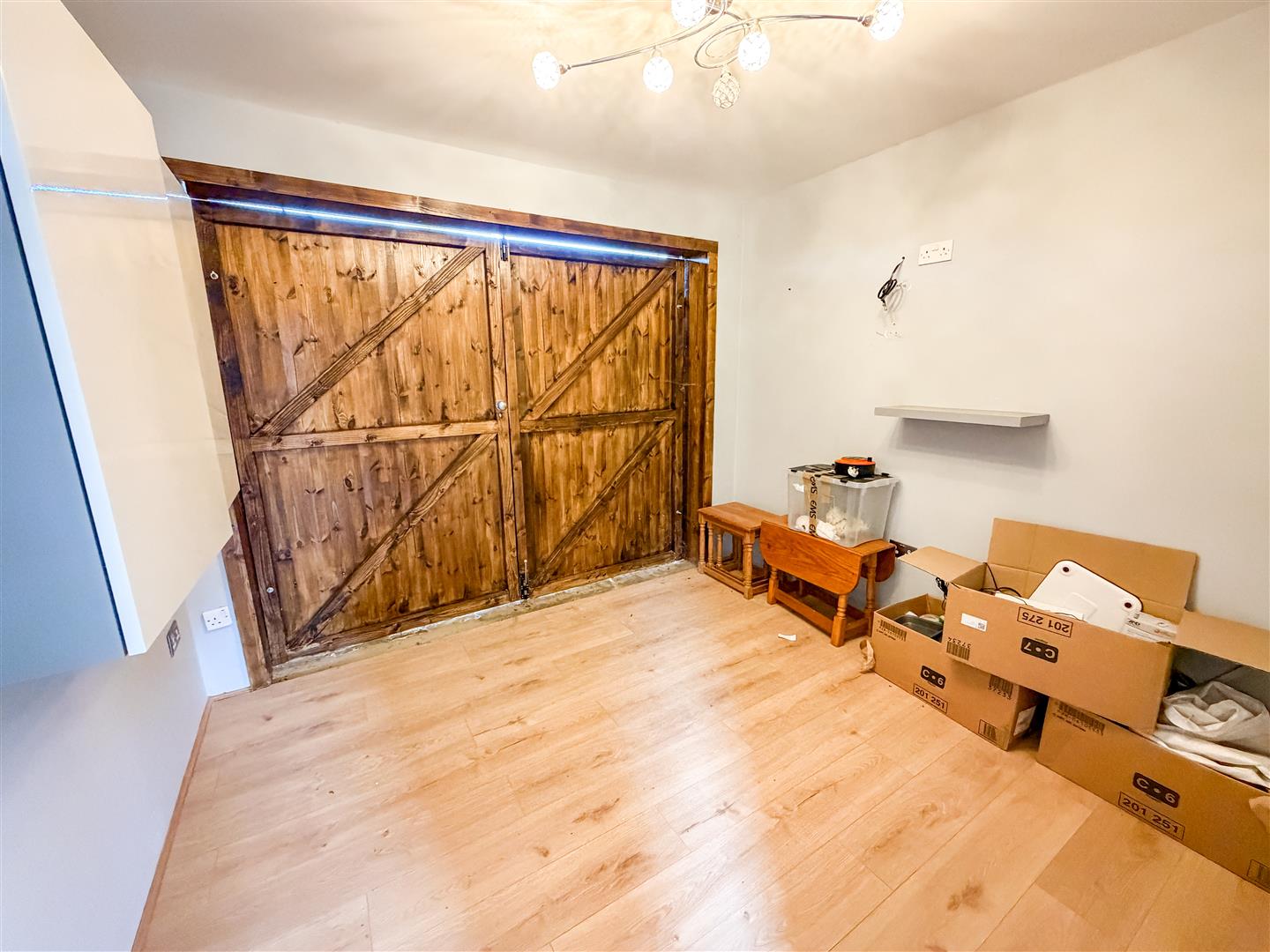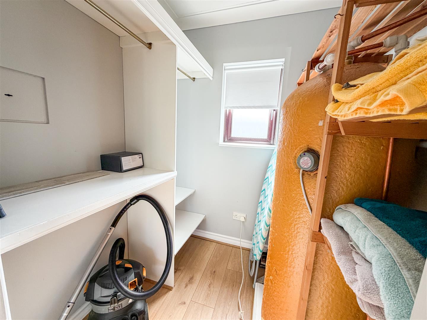 Fitted hanging rails and storage shelving. Wood effect flooring. Hot water cylinder (not tested). Double glazed window to rear.