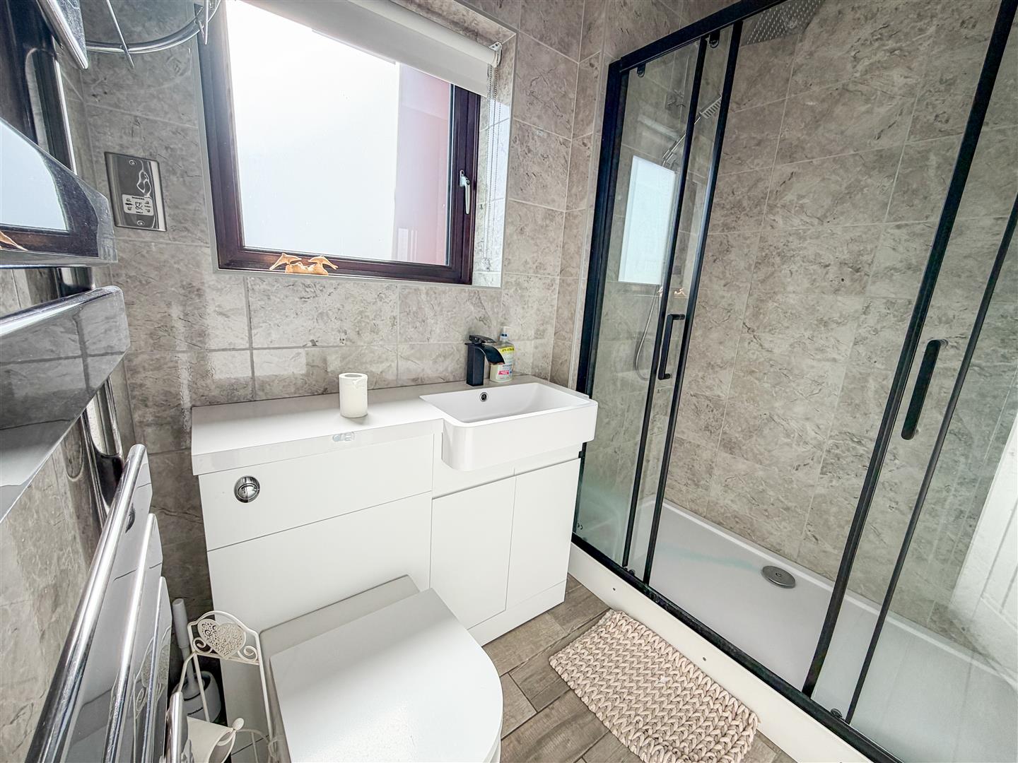 Fitted with a modern three-piece white suite. Comprises double shower cubicle with sliding doors and integrated shower. Concealed cistern low level W.C. Vanity wash hand basin with cupboards below. Chrome effect heated towel rail. Fully tiled walls. Tiled flooring with under floor heating. Double glazed window to rear.