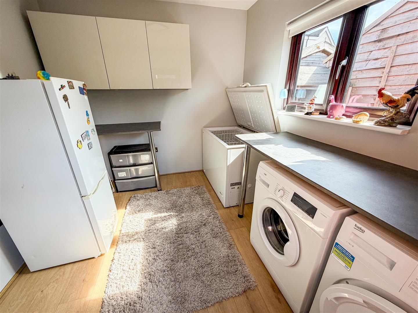 Wood effect flooring. Square edge work surfaces. Space and plumbing below for washing machine and tumble dryer. Large chest freezer space. Fitted wall units. Space for additional Fridge/Freezer. Double glazed window to rear. Double glazed personal access door to rear garden.