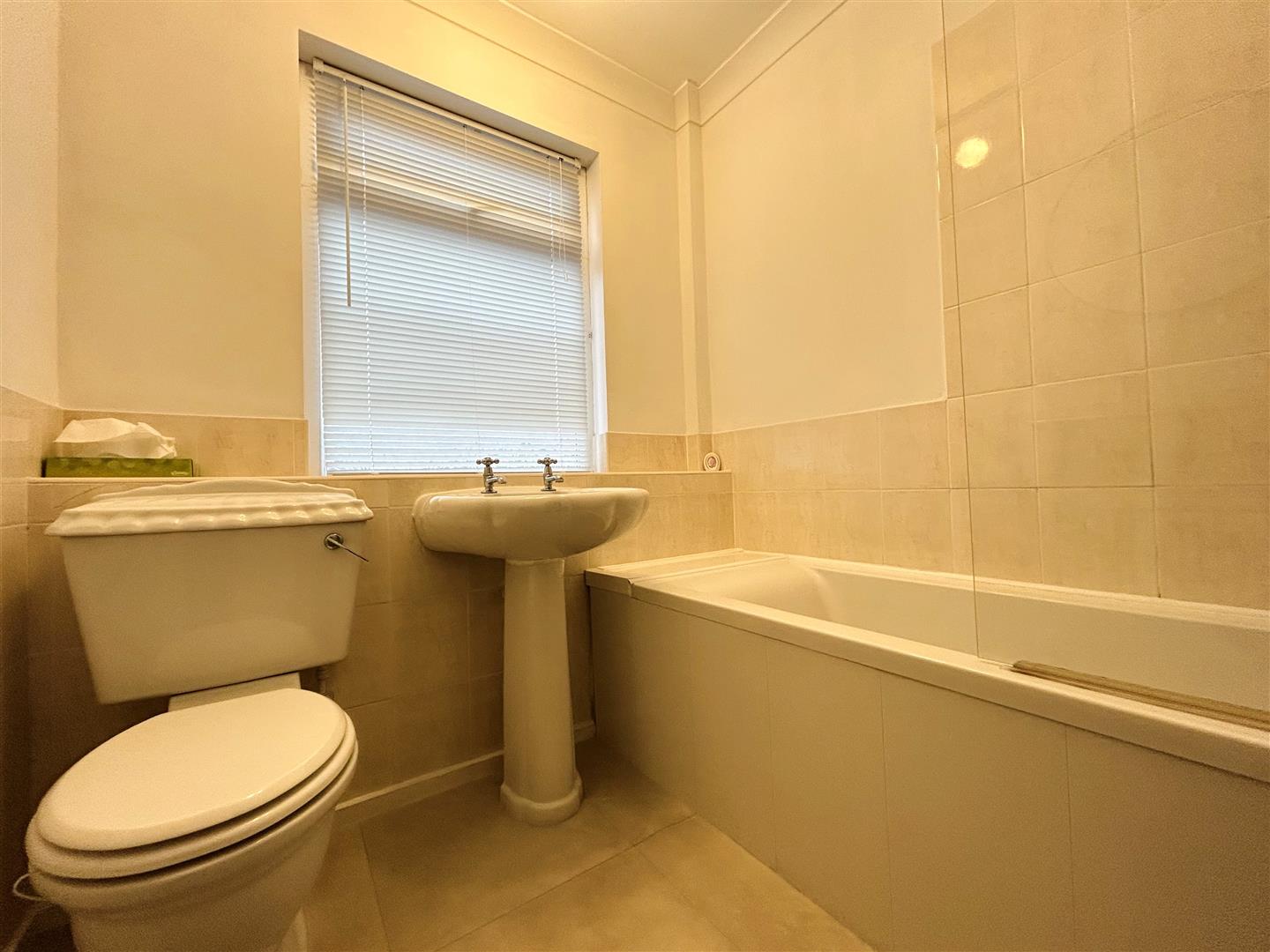 Modern bathroom comprising of a panel enclosed bath with shower screen, low level WC and hand wash basin with pedestal. Part tiled walls. Double glazed window.