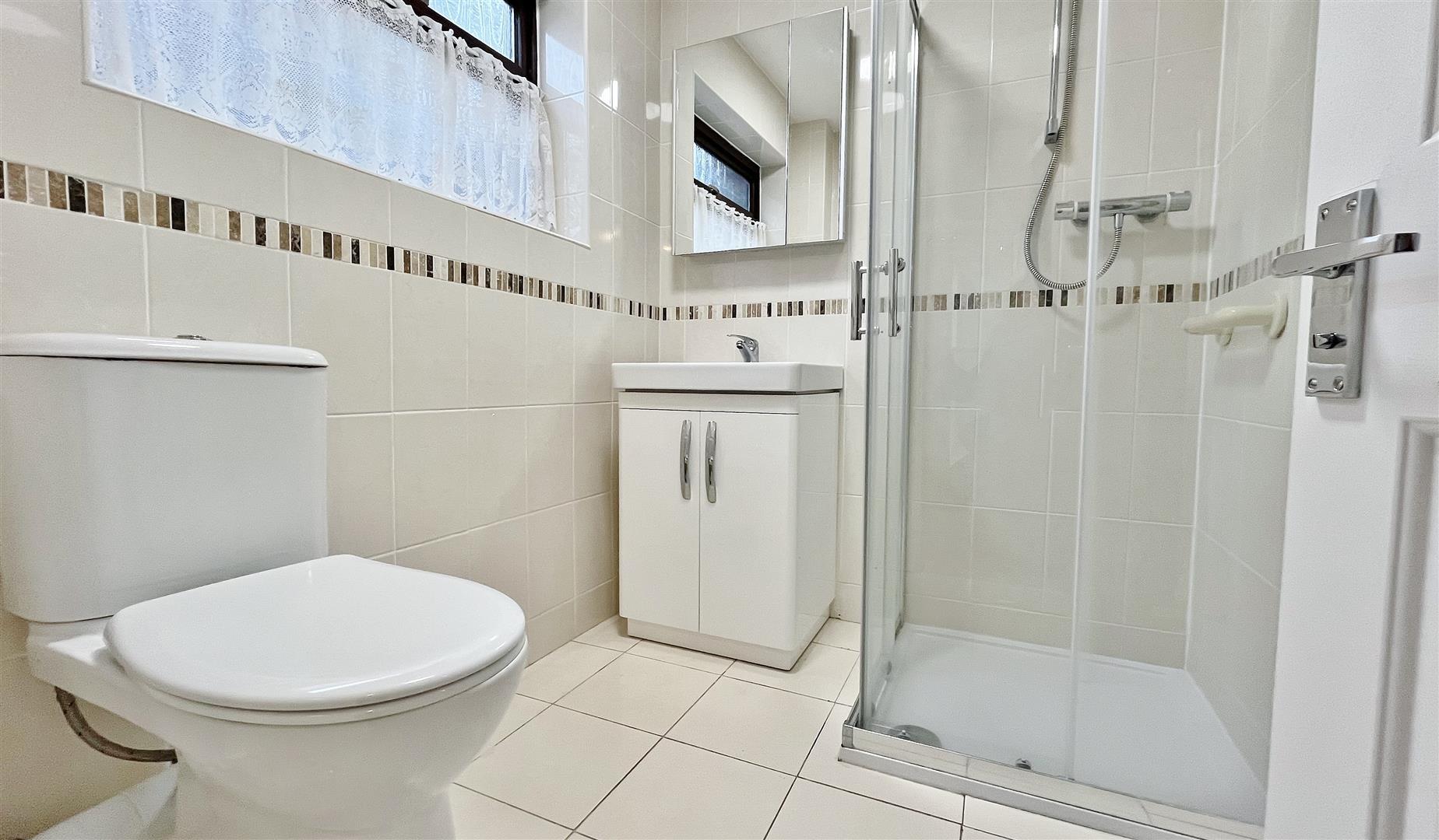 White suite. Low level WC. Vanity hand wash basin with storage cupboard under. Fitted shower cubicle with wall mounted integrated shower. Fully tiled walls. Tiled flooring. Heated towel rail. Obscured sealed unit double glazed window to side.