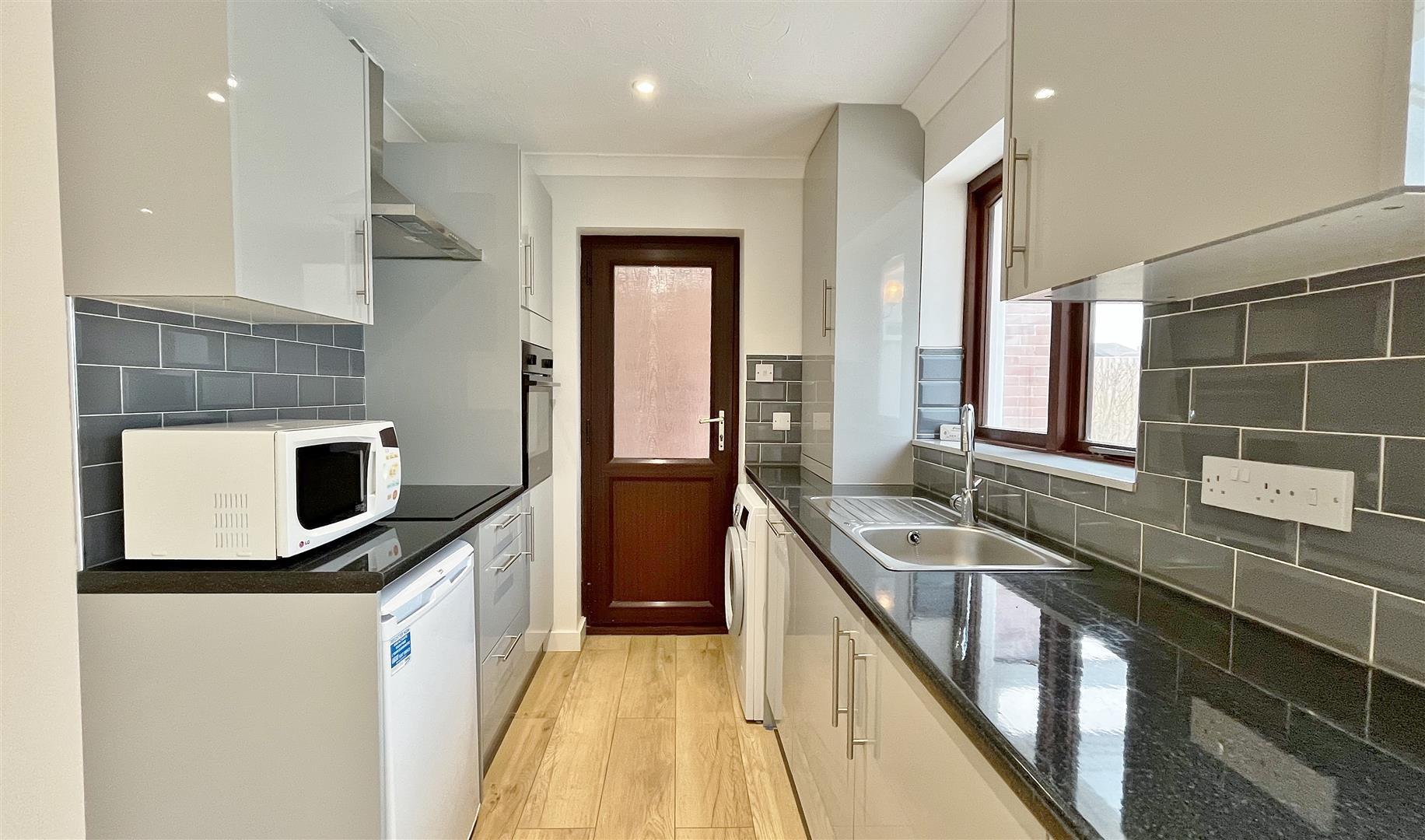 Fitted with a range of matching white high gloss units. Rolled edge work surfaces. Inset stainless steel bowl sink and drainer unit. Inset four ring electric hob with extractor hood above. Built in eye level electric oven. Further selection of matching high gloss units both at eye and floor level. Part tiled walls. Wood effect laminate flooring. Plumbing for washing machine. Space for fridge or freezer. Enclosed combination boiler. Spotlights. Sealed unit double glazed window to rear. Obscured sealed unit double glazed door to side.
