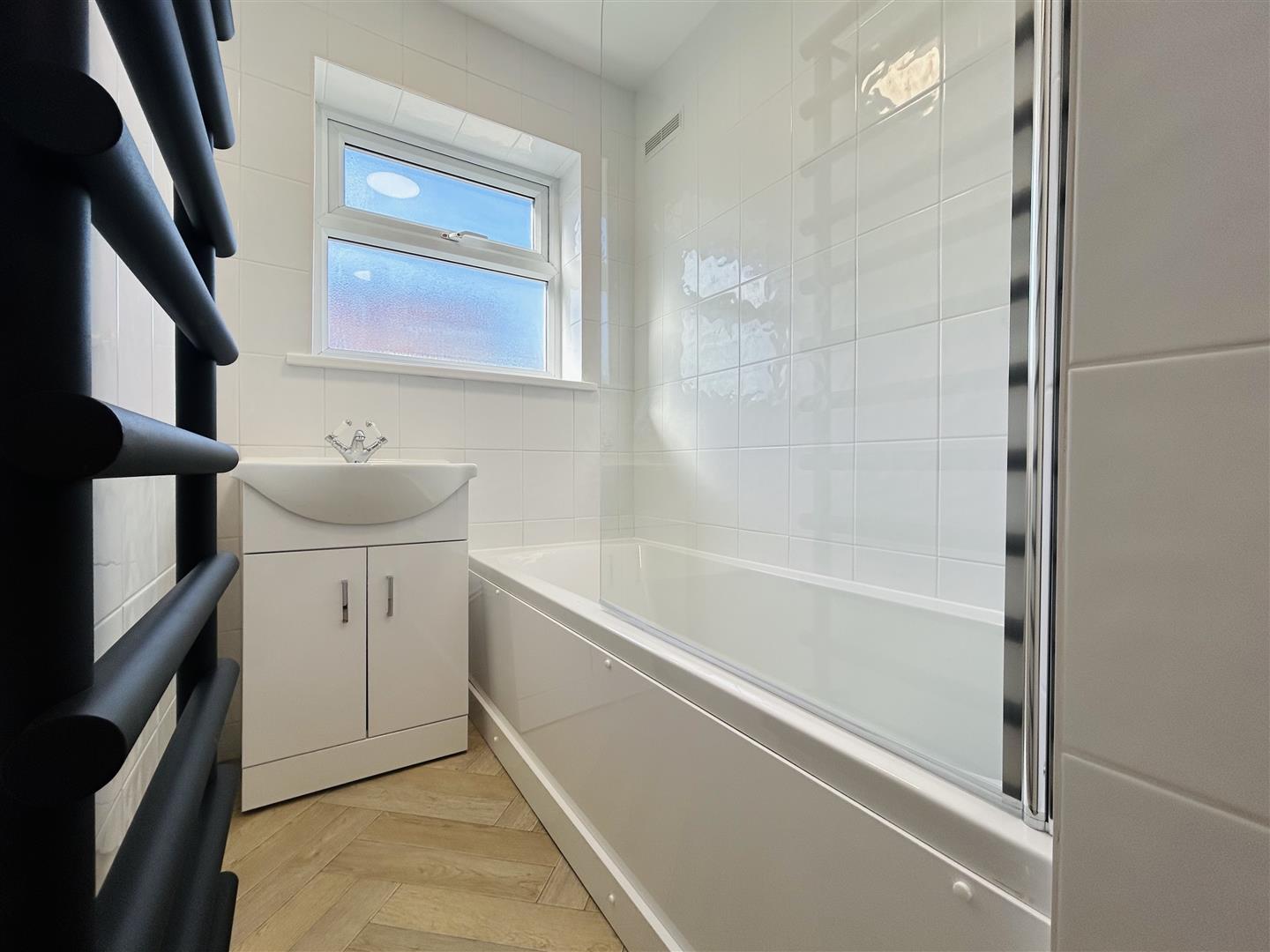 Panelled enclosed bath, electric shower above, vanity hand wash basin with storage underneath. Low level W.C. Fully tiled walls. Double glazed windows to rear.