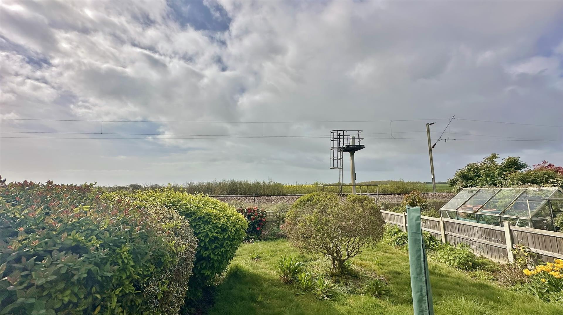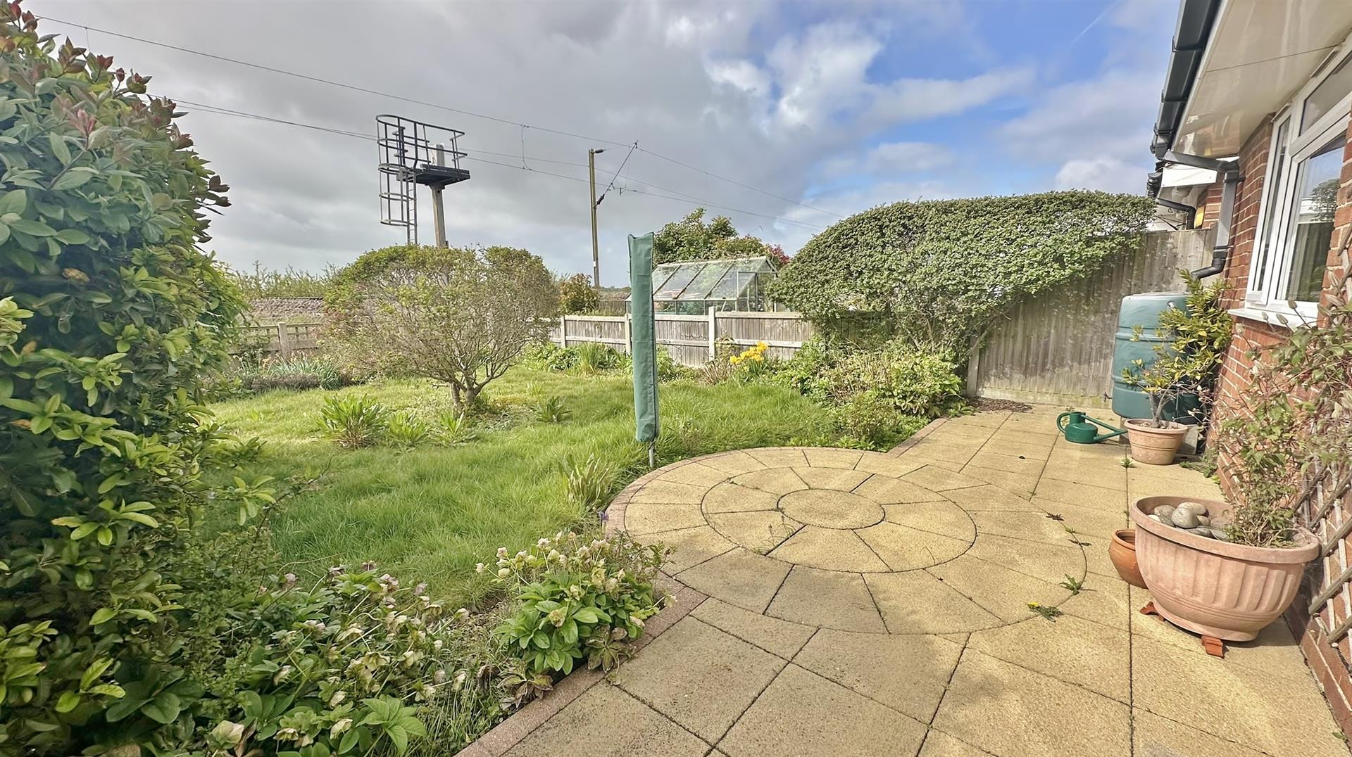 Commencing with patio area. Remainder laid to law. Flower and shrub borders. Panel fencing. Distant farmland views. Access to front via side gate. Courtesy door leading to garage.