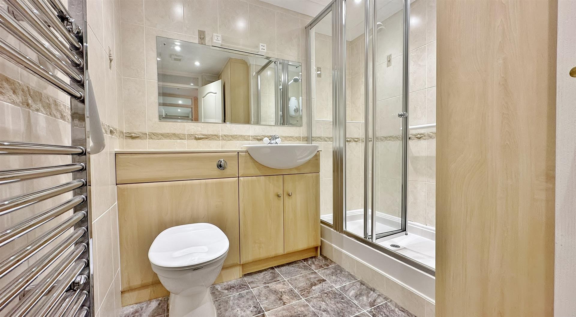 Modern white suite comprises low level w/c. Vanity wash hand basin with cupboards under. Independent double length shower cubicle with wall mounted shower (not tested). Heated towel rail. Fully tiled walls.