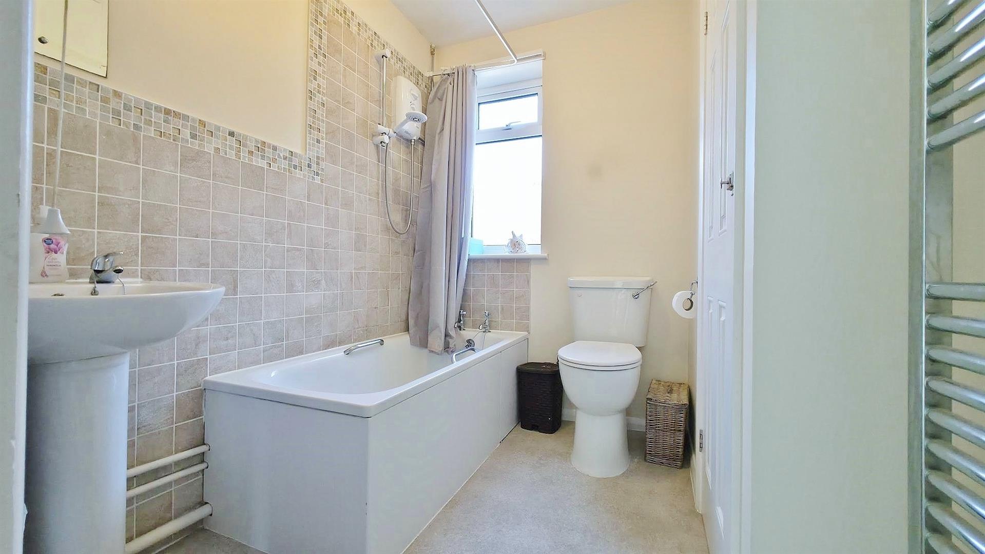 White suite comprising of low level W/C. Pedestal wash hand basin. Panelled bath with wall mounted electric shower. Part tiled walls. Built in storage cupboard. Heated towel rail. Obscured sealed unit double glazed window to side.