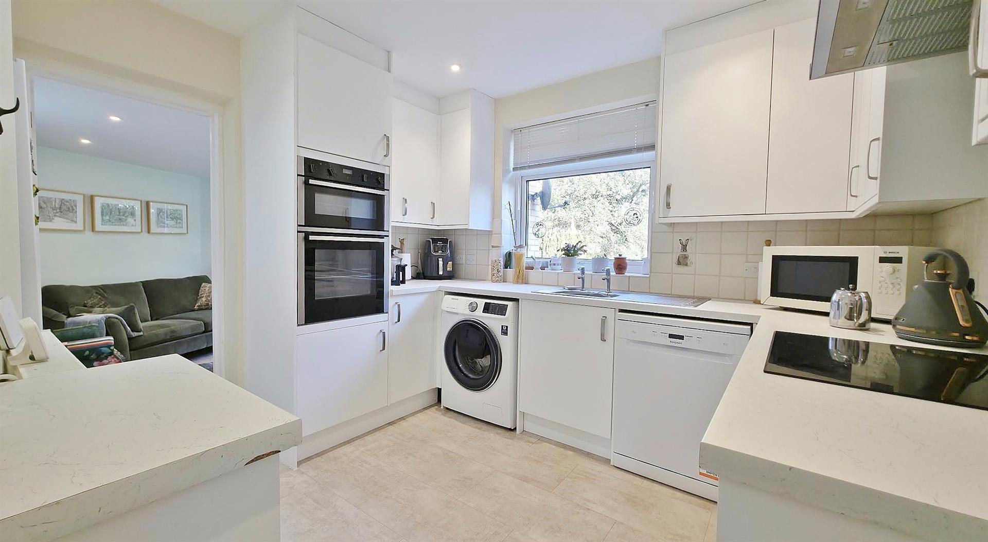 Fitted with a range of modern matching fronted units. Marble effect rolled edge work surfaces. Inset stainless steel bowl sink drainer unit. Inset four ring 'Neff' induction hob with fitted extractor fan above. Further selection of matching units at both eye and floor level. Built in eye level double 'Neff' oven. Plumbing for automatic dishwasher. Plumbing for automatic washing machine. Space for fridge/freezer. Part tiled walls. Radiator. Sealed unit double glazed window to rear. Door leading to: