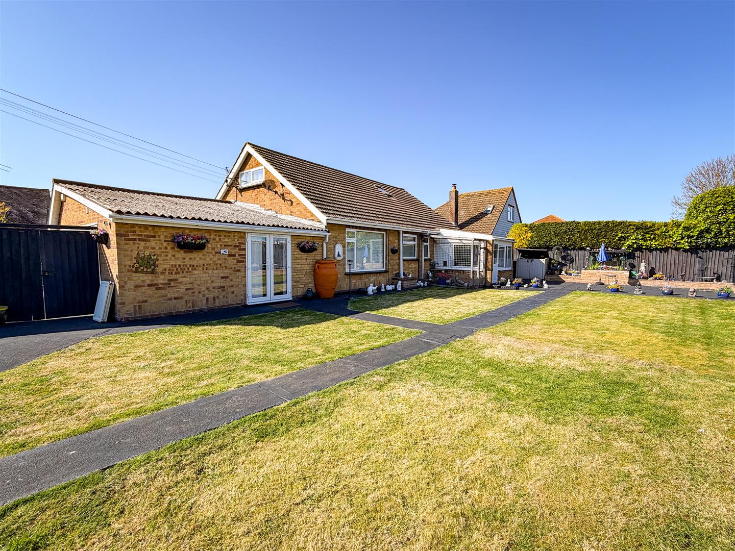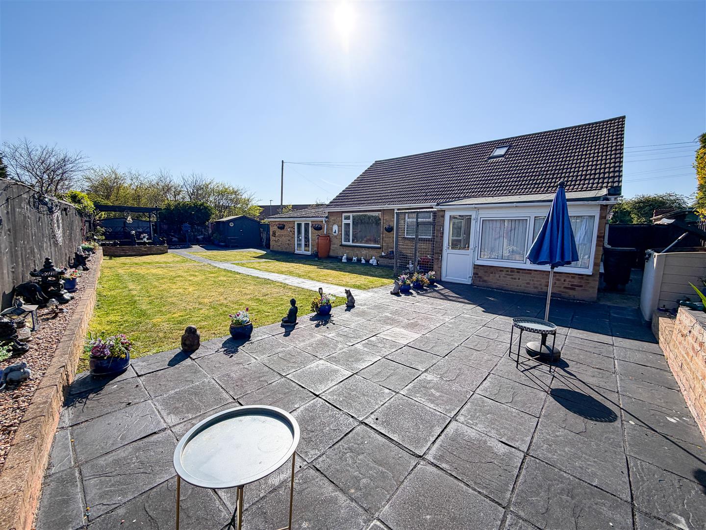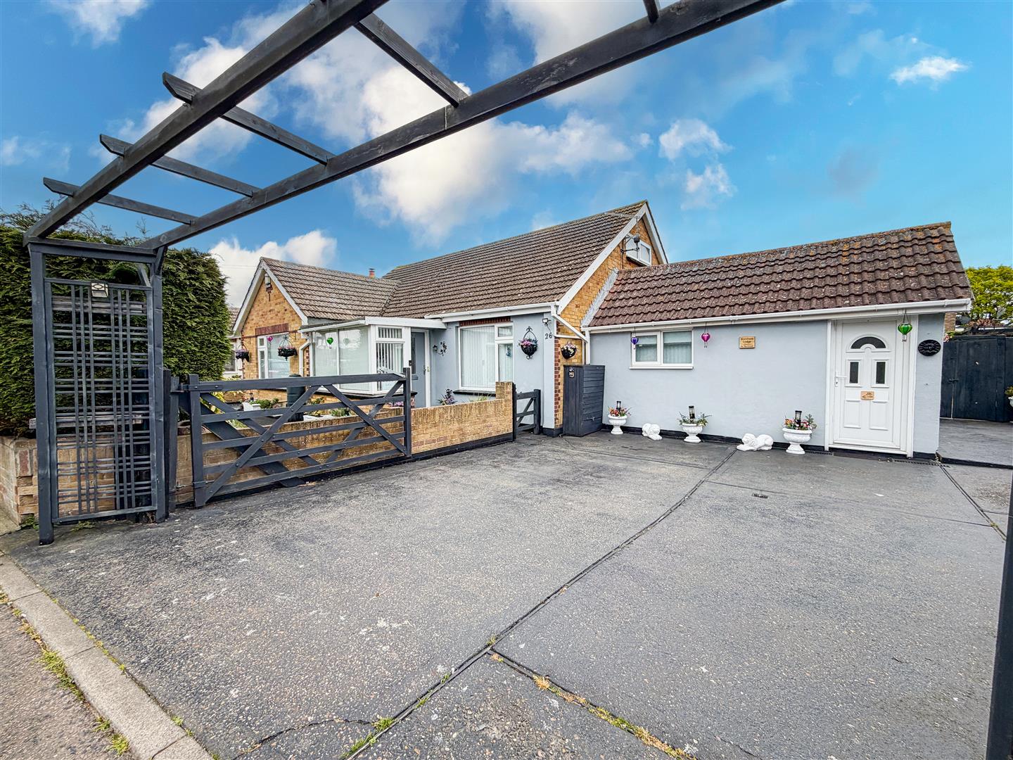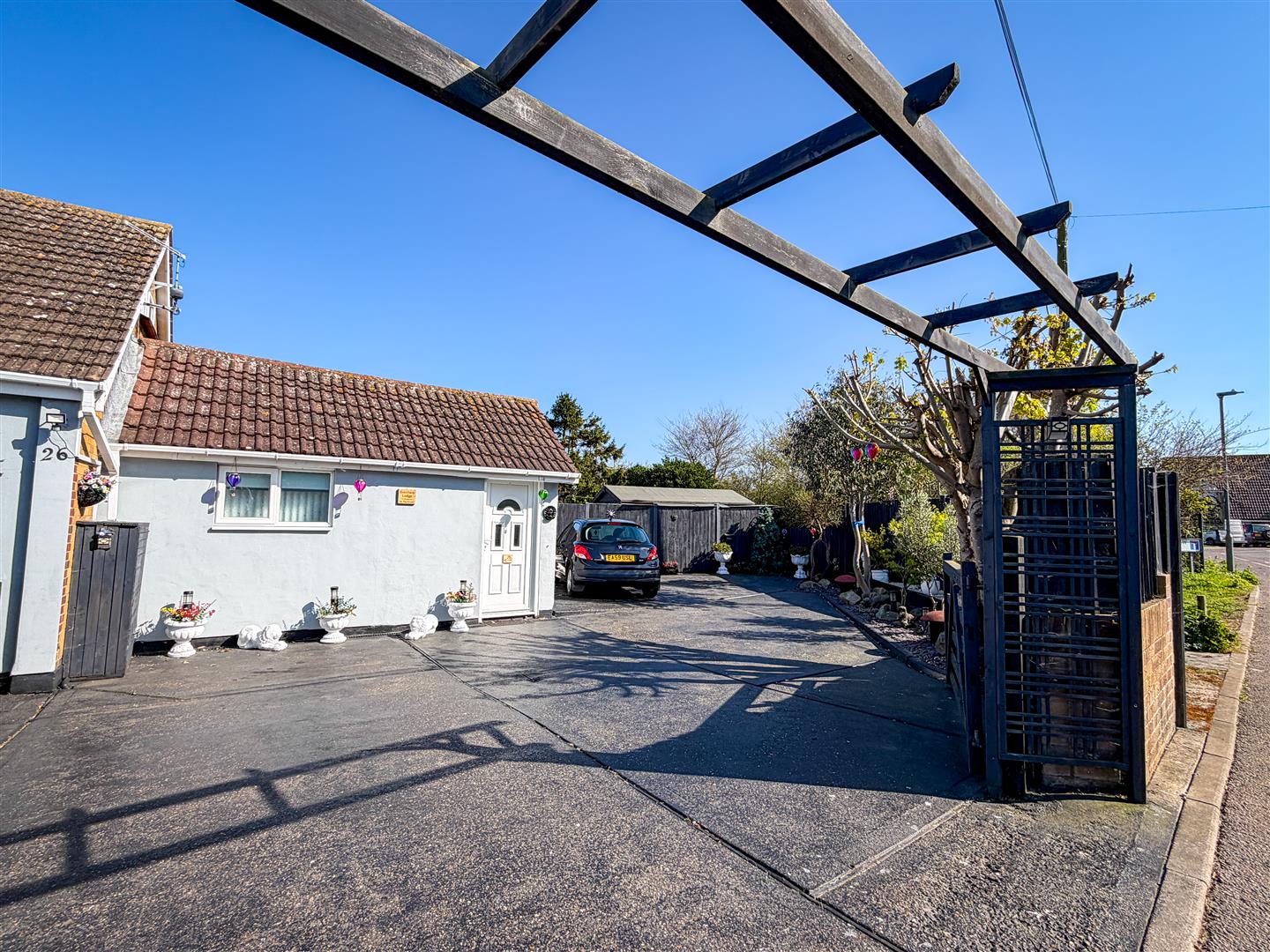 The property is positioned on a sizeable plot which includes a wide rear garden which is around 95' max. Mainly laid to lawn with array of flower, shrub and shingle borders. Raised patio area with wooden pergola above. Enclosed by panel fencing. Timber Storage Shed (12'10 x 7'8 - Power and Light Connected). Metal Storage She (10'9 x 9'8 - Power Connected). Side pedestrian access to front via gate.