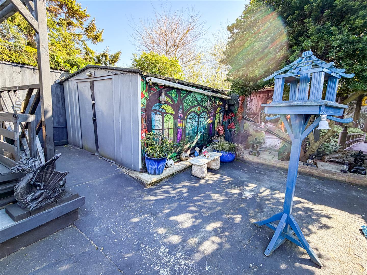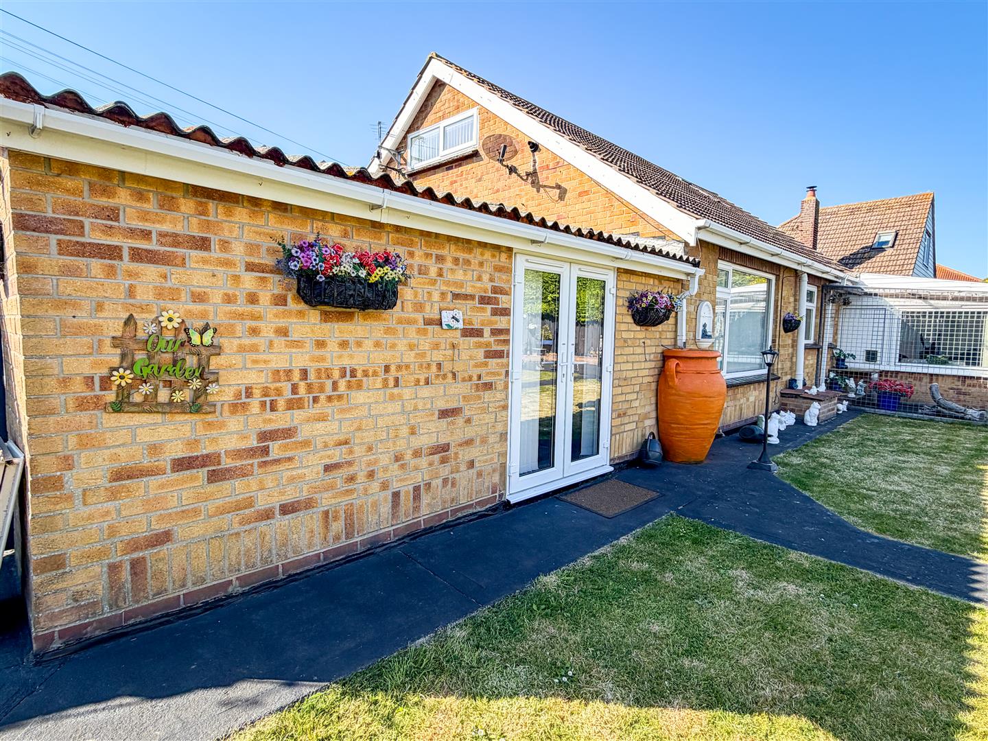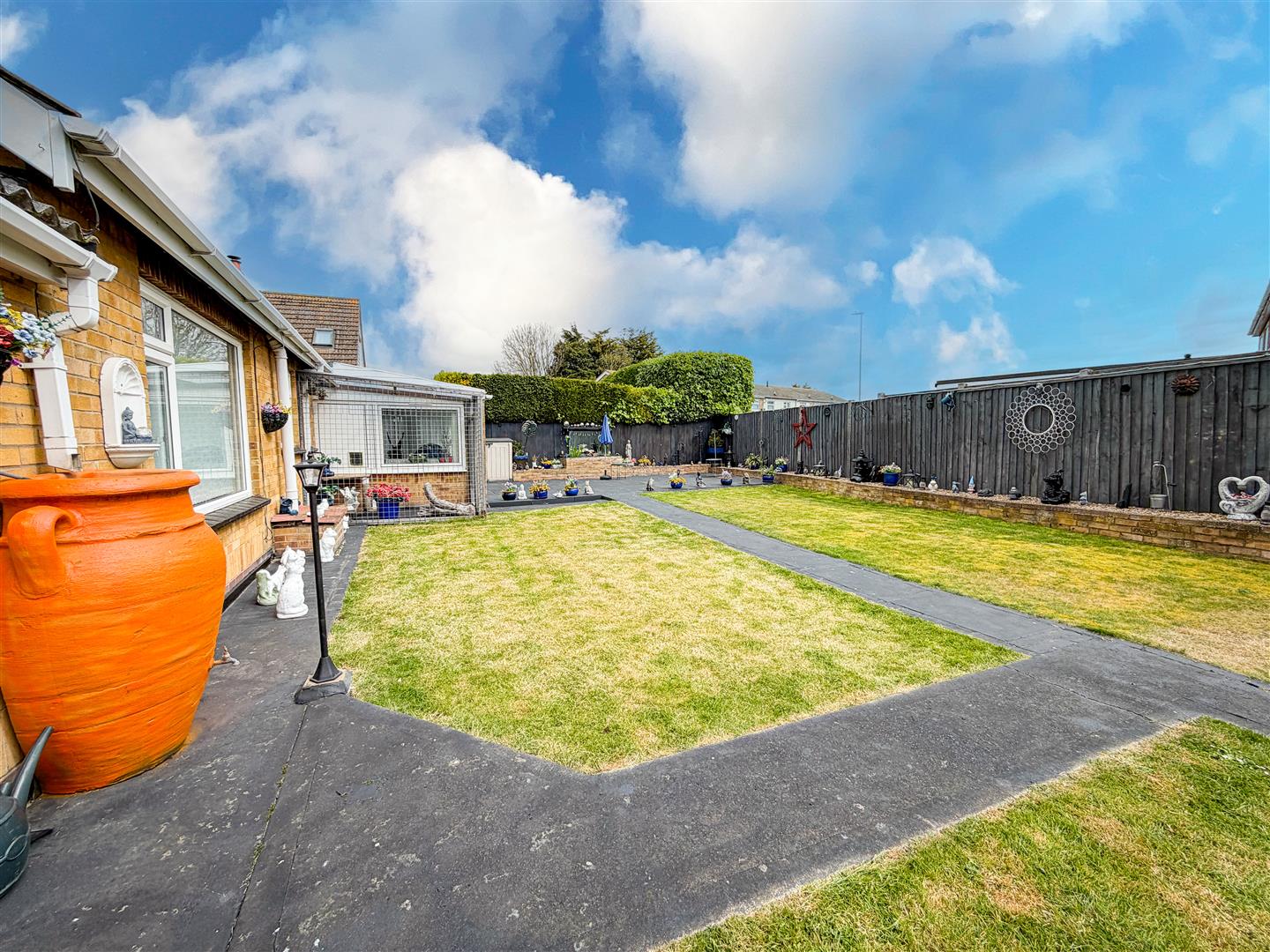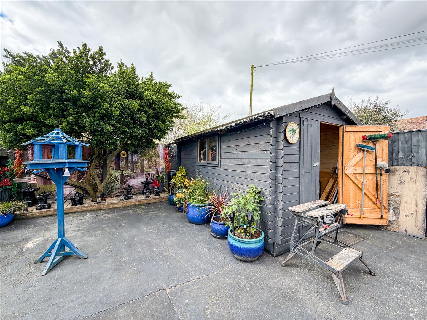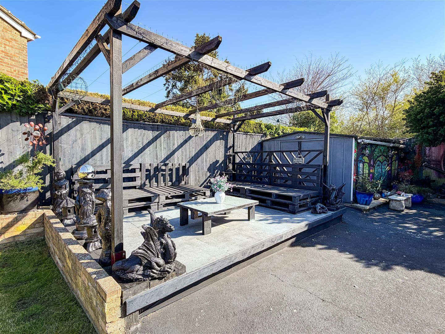 The property is positioned on a sizeable plot which includes a wide rear garden which is around 95' max. Mainly laid to lawn with array of flower, shrub and shingle borders. Raised patio area with wooden pergola above. Enclosed by panel fencing. Timber Storage Shed (12'10 x 7'8 - Power and Light Connected). Metal Storage She (10'9 x 9'8 - Power Connected). Side pedestrian access to front via gate.