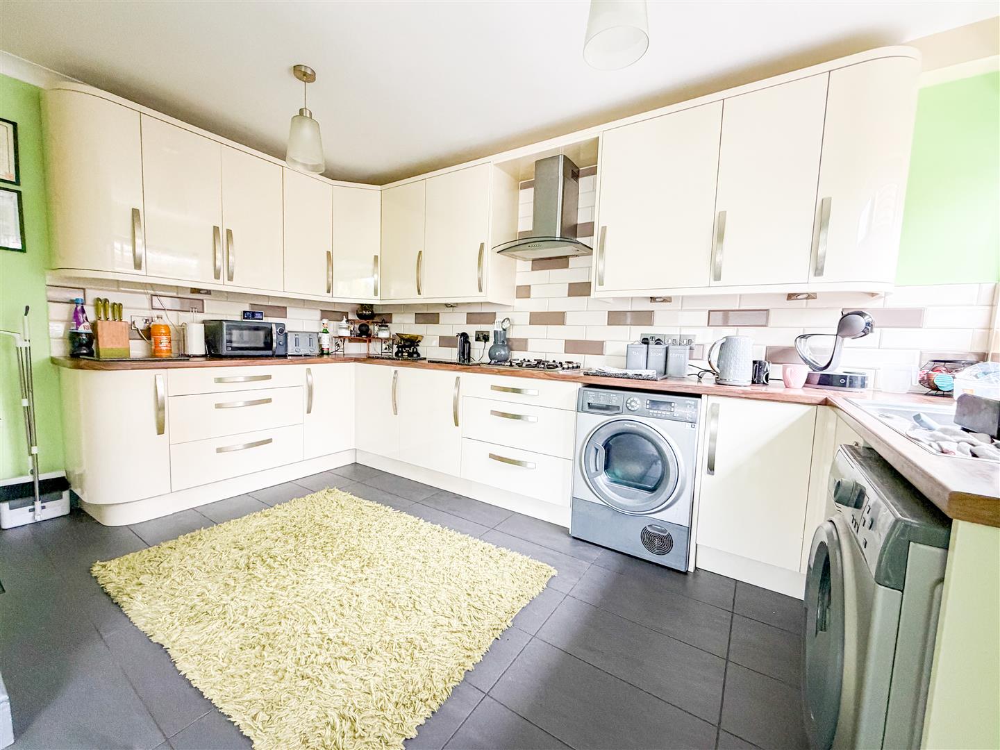 Modern fitted kitchen. Comprises cream gloss fronted units with curved end units. Wood effect square edge work surfaces with cupboards and drawers below. Range of matching wall mounted units. Inset four ring gas hob. Inset one and a half bowl stainless steel single drainer sink with built in macerator. Built in high level oven and grill (all appliances are not tested). Plumbing and space for washing machine and dishwasher. Matching work surfaces in Dining Area with space under for multiple under counter fridge & freezers. Radiator. Tiled flooring. Two double glazed windows to side. Double glazed door to side. Double glazed patio doors leading to Conservatory.