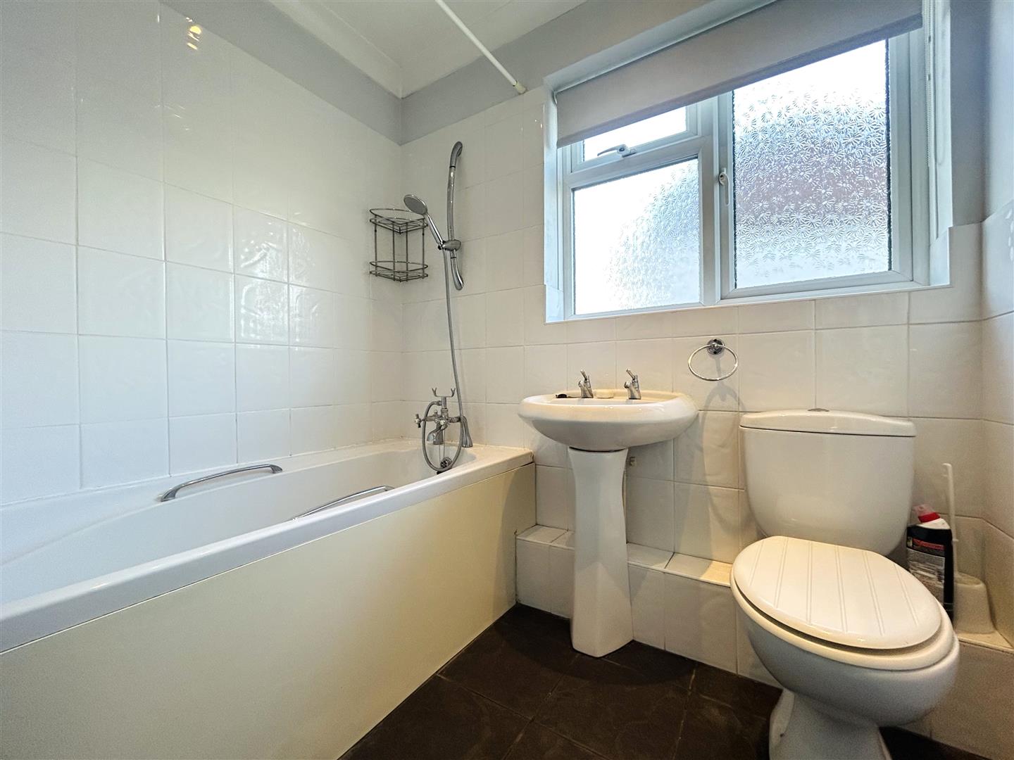 Panel enclosed bath, shower attachment above. Low level W.C. Part tiled walls. Double glazed window to side.