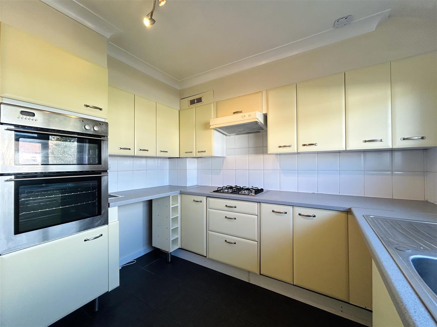 Cupboards at both eye and floor level, integrated oven and hob, extractor hood above, space & plumbing facilities for washing machine, part tiled walls. Double glazed window to front. Radiator.