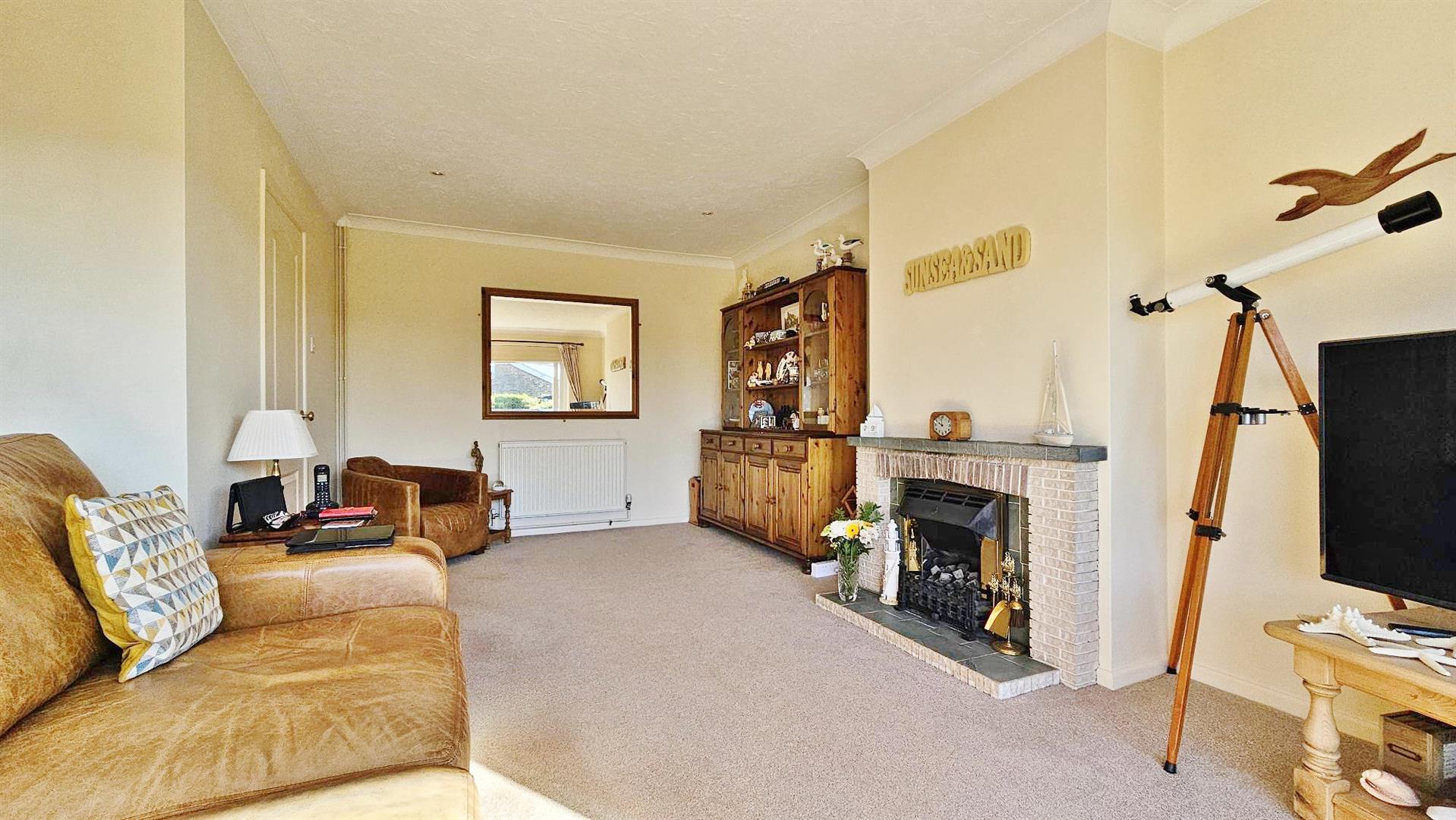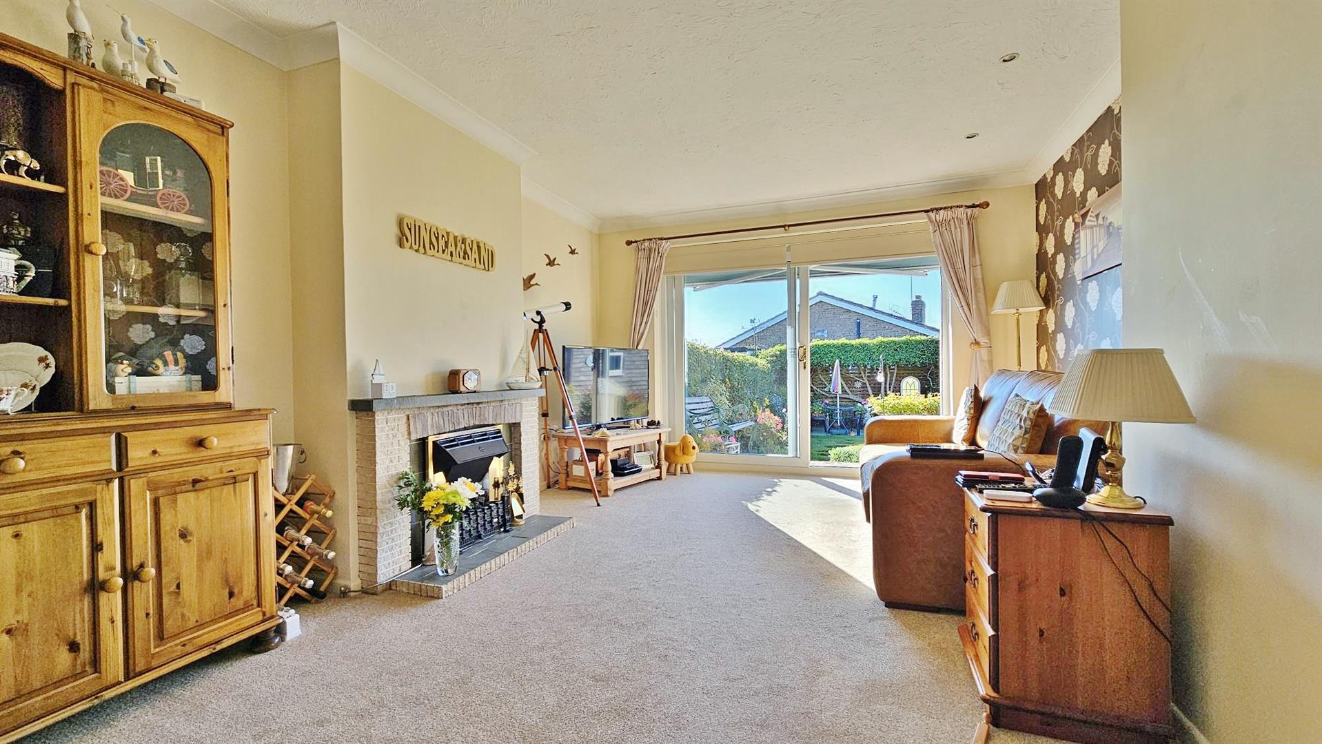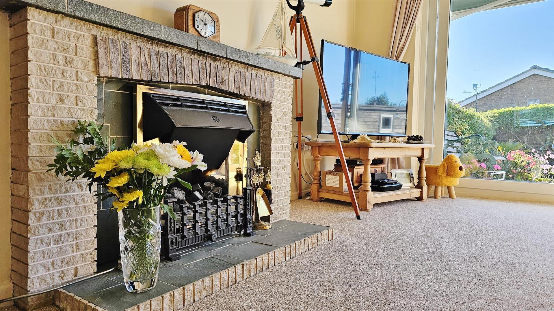 Tiled fireplace with inset gas fire. Spotlights. Two radiators. Sealed unit double glazed sliding patio door leading to: