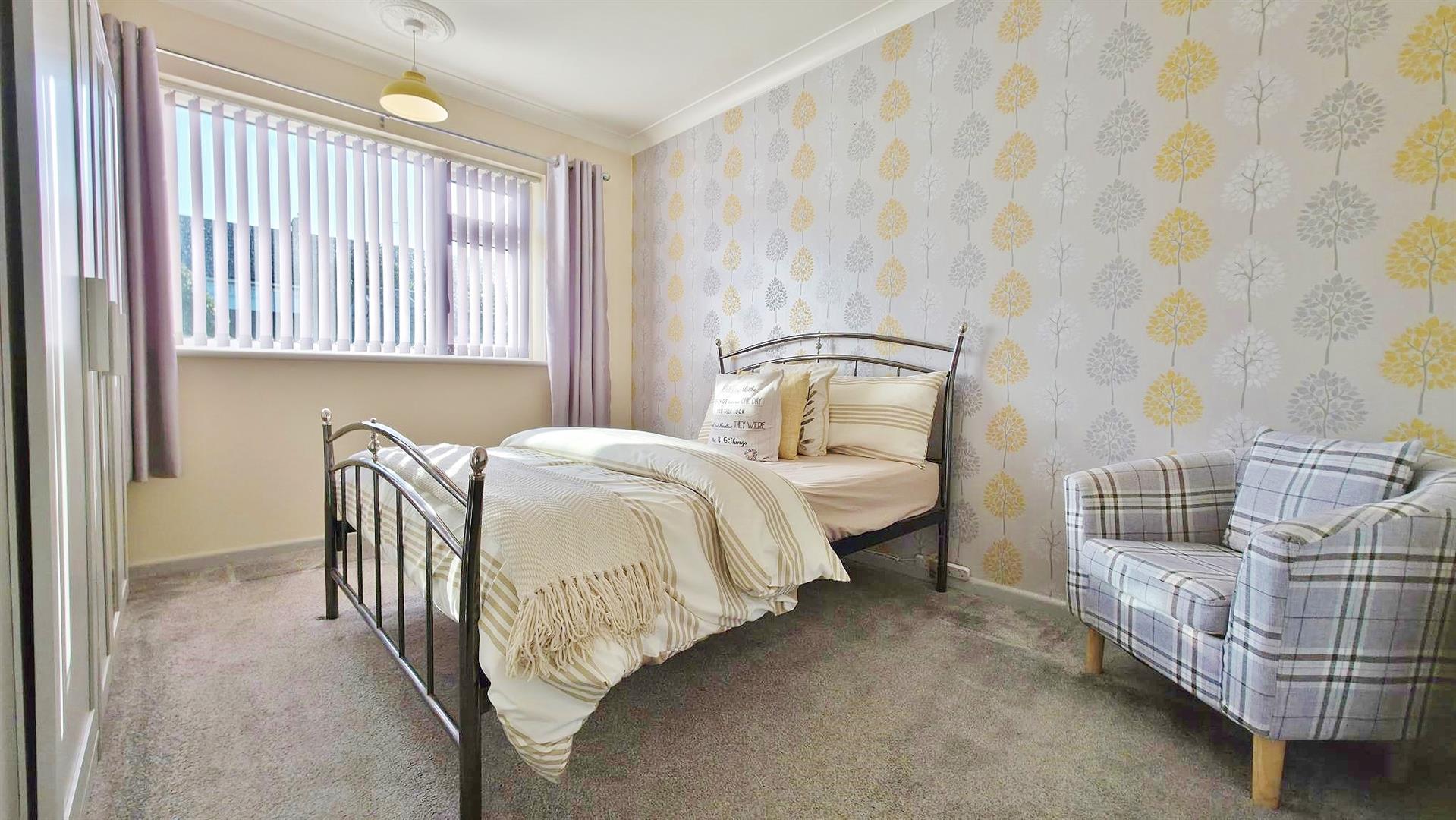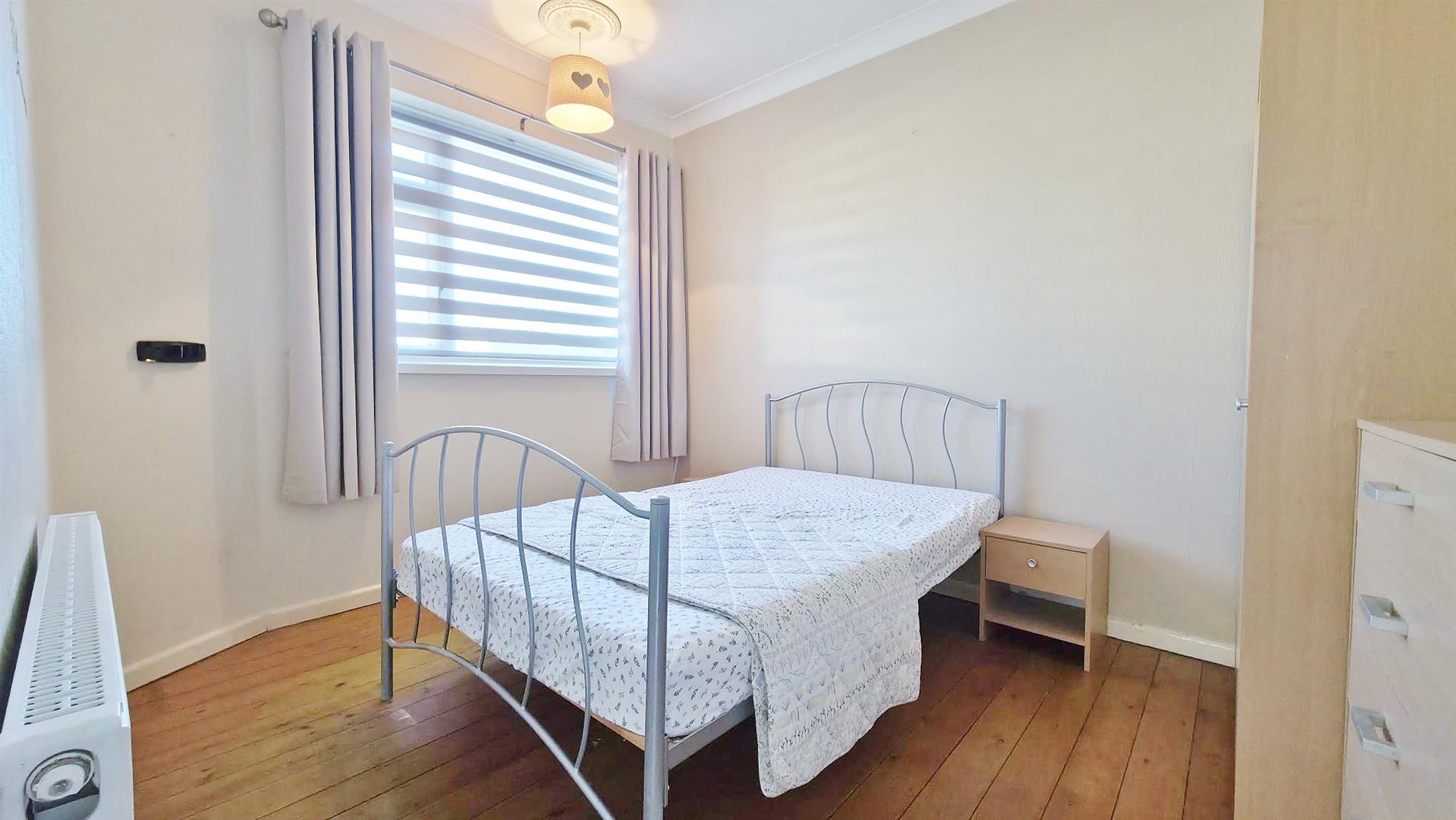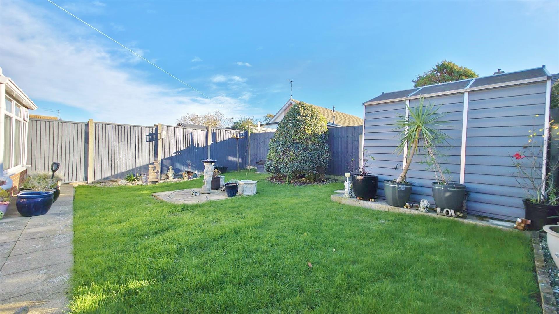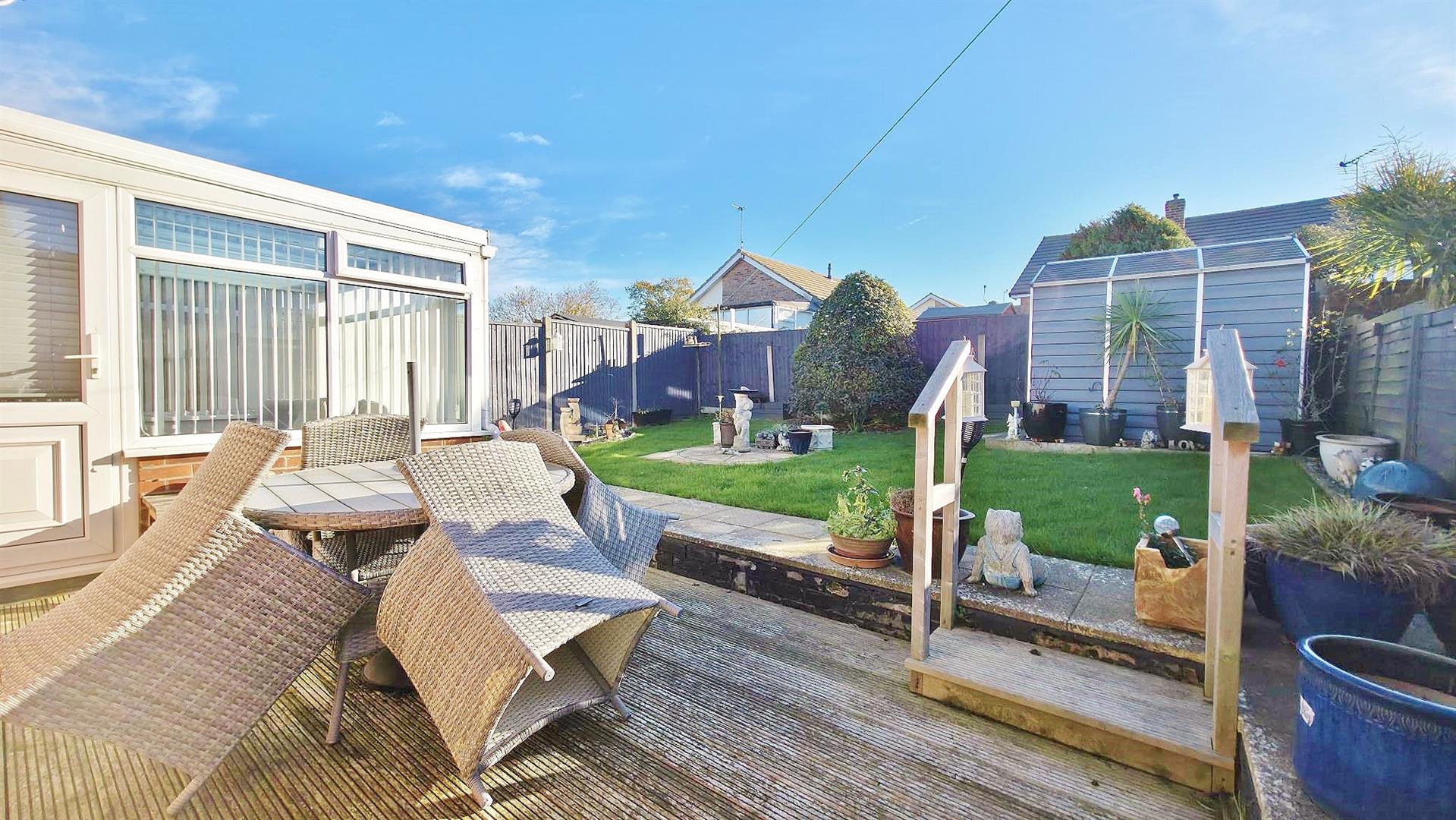 South facing. Part wood decked seating area. Part laid to lawn. Shingled beds with array of bushes. Metal constructed storage shed to remain. Outside light. Outside tap. Wooden storage shed to remain. Enclosed by panelled fencing.