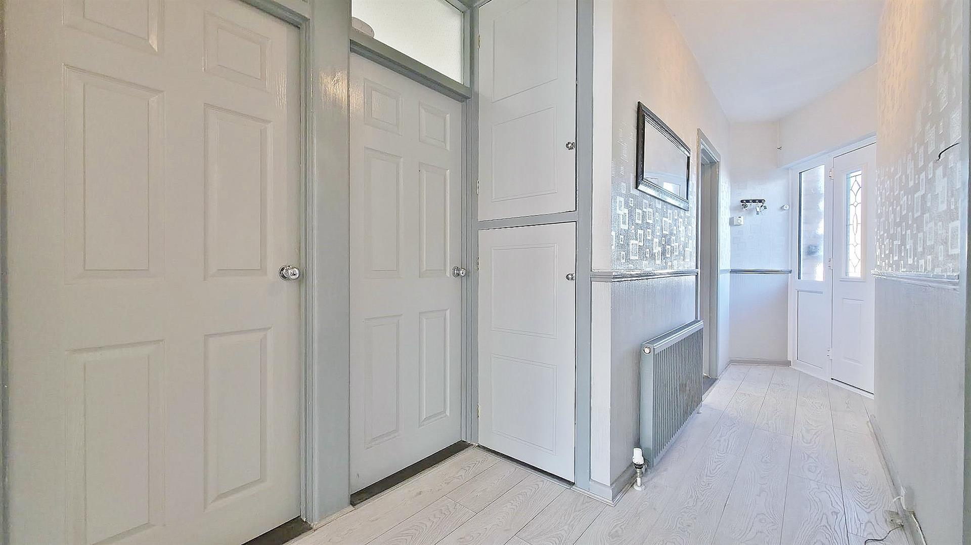 Loft access with pull down ladder. Built in storage cupboard housing wall mounted Worcester combination boiler. Wood laminate flooring. Radiator. Doors to all rooms. Door to:-