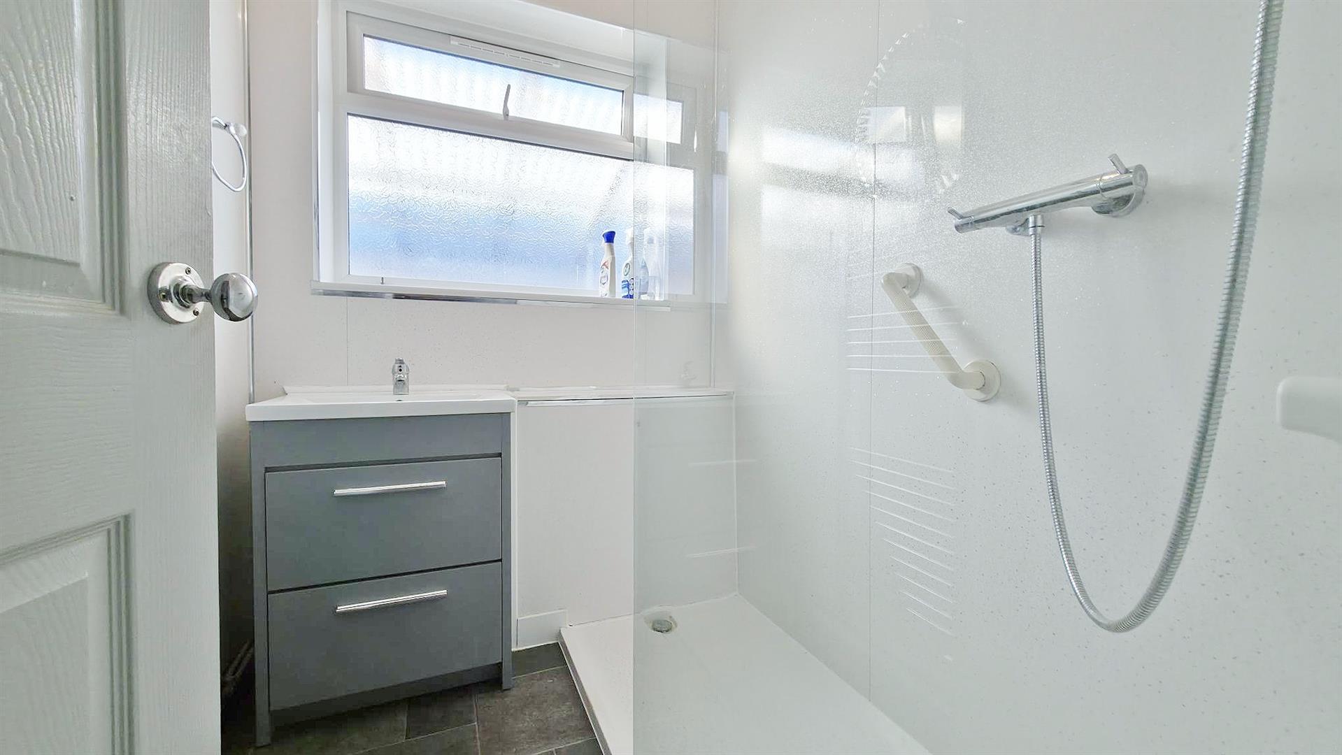 Modern white suite comprises vanity wash hand basin with storage drawers under. Fitted double length shower cubicle with integrated shower controls and fitted glass shower screen. Heated towel rail. Obscured sealed unit double glazed window to side.