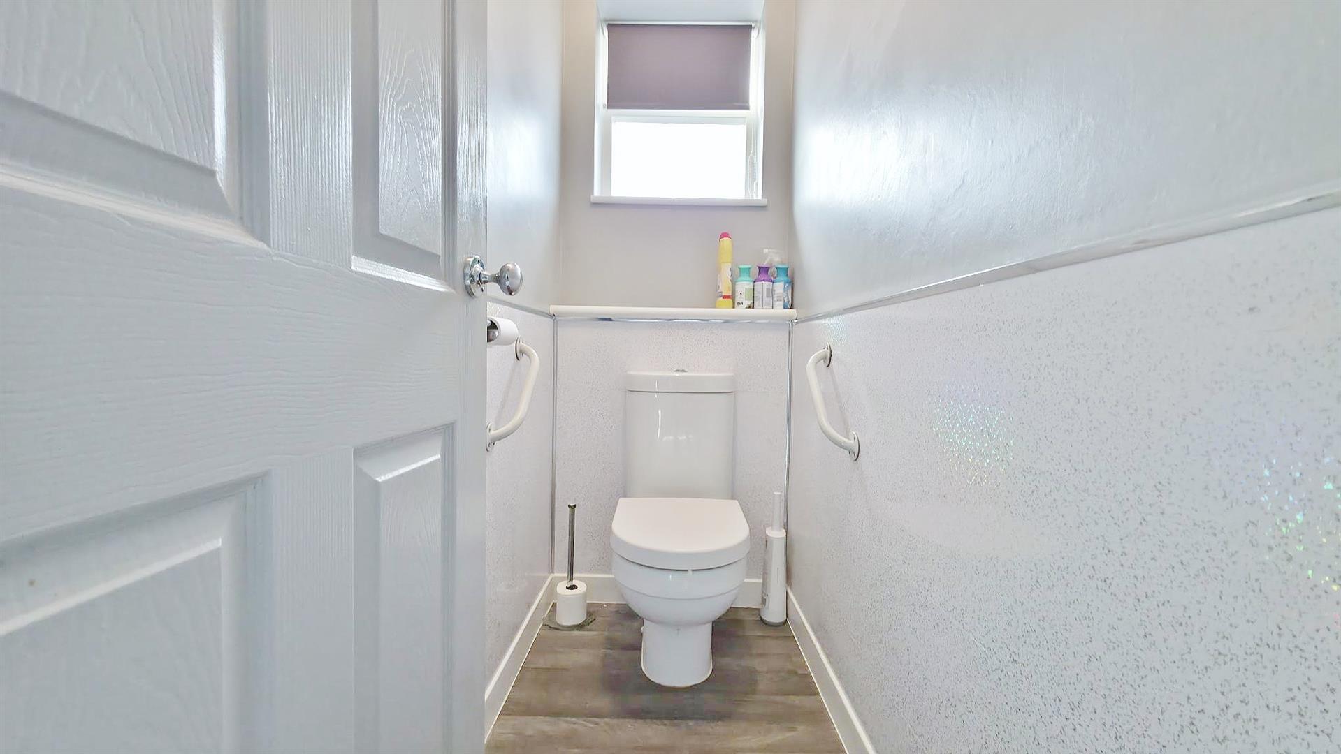 White low level w/c. Wood effect flooring. Obscured sealed unit double glaze window to side.