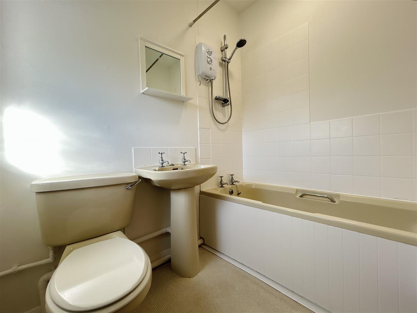 Paneled enclosed bath, electric shower over. Low level W.C. Hand wash basin pedestal, part tiled walls. Double glazed window to rear.