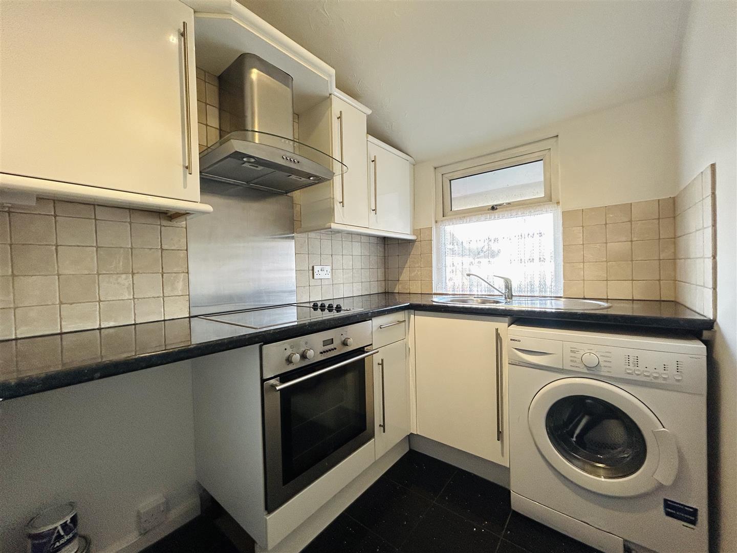 Cupboard's at both eye and floor level, integrated oven & hob, extractor hood above. Plumbing facilities for washing machine, part tiled walls, double glazed window to front.