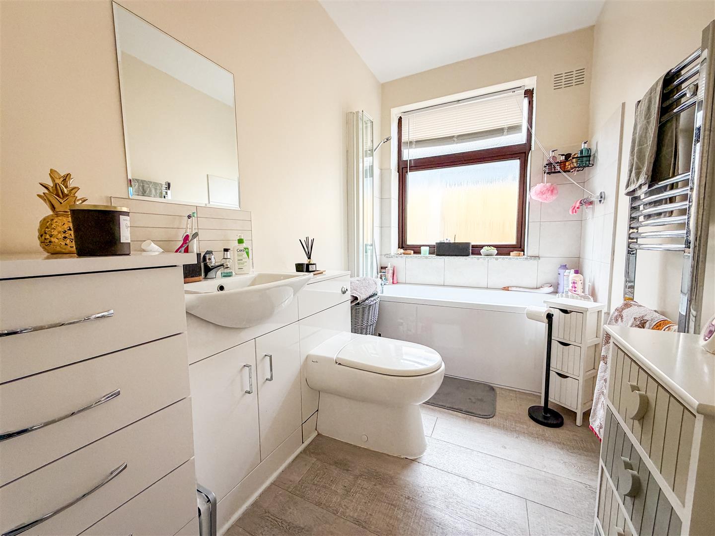Fitted with a modern three piece White suite comprising panelled bath with mixer tap and shower attachment with a folding glazed shower screen. Concealed cistern low level W.C. with vanity wash hand basin with cupboards below. Tiled splashbacks. Chrome effect heated towel rail. Double glazed window to side.