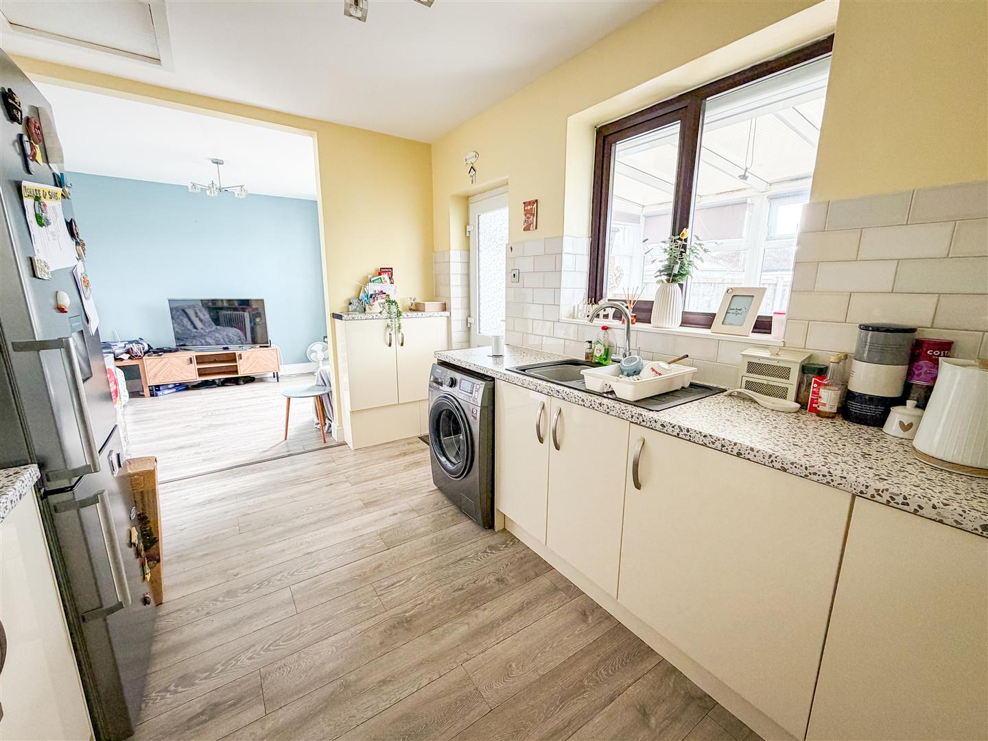 Fitted with a range of Gloss fronted units with laminated rolled edge work surfaces with cupboards and drawers below. Range of matching wall mounted units. Inset one and a half bowl single drainer sink unit with mixer tap. Cooker space. Space and plumbing for washing machine. Tall fridge freezer space. Tiled splashbacks. Wall mounted gas combination boiler serving hot water central heating systems (not tested). Double glazed window to side. Wood effect flooring. Double glazed window to rear. Double glazed door leading to conservatory. Open access to lounge.