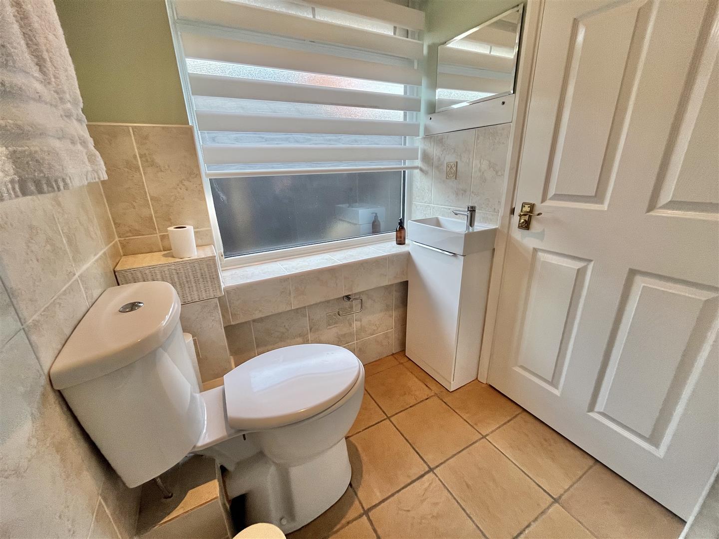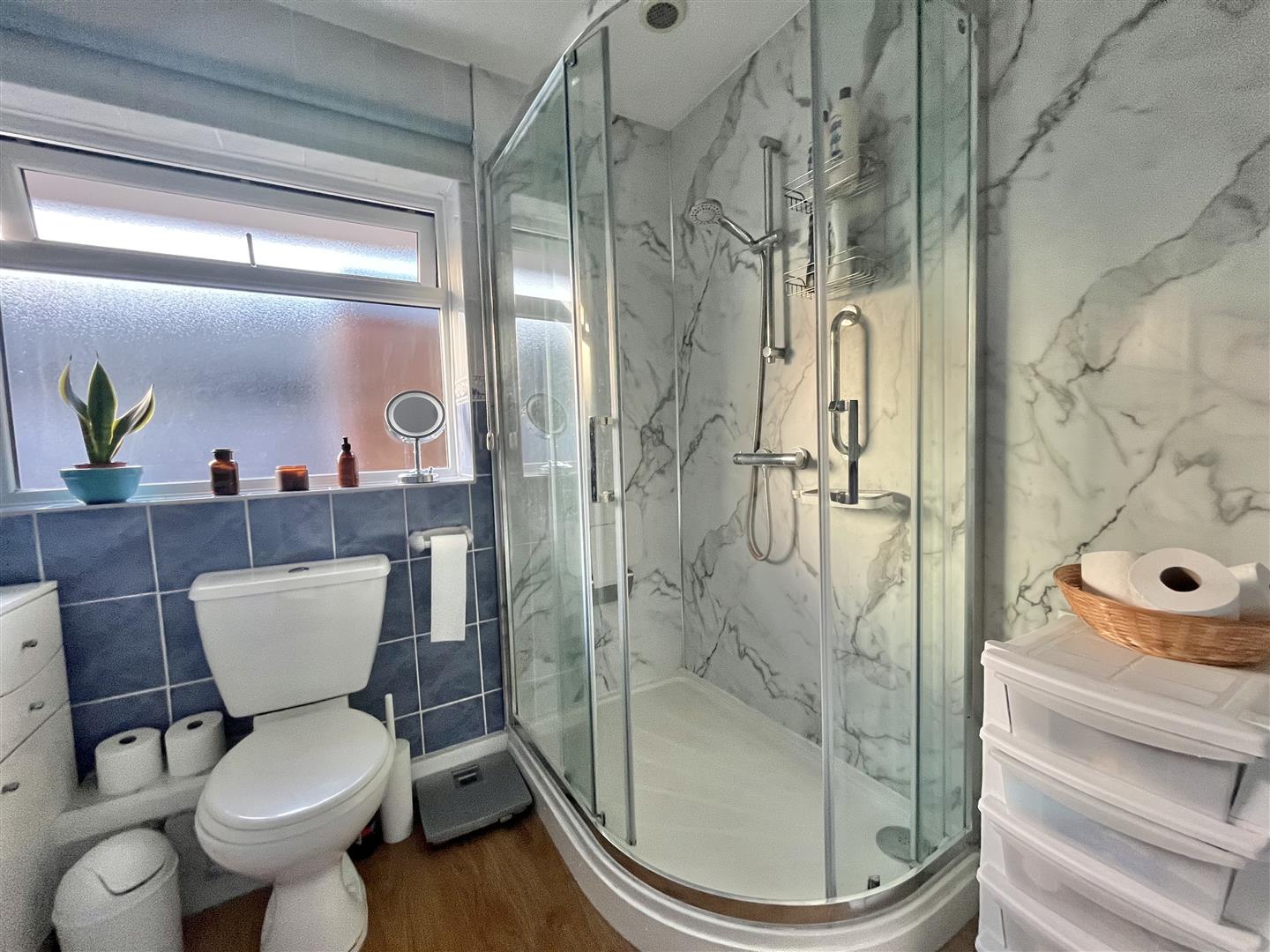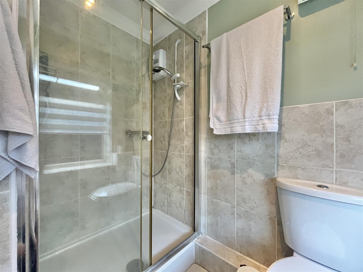 Three piece white suite comprising low level W.C. Wash hand basin with cupboard below. Step in shower cubicle with integrated shower unit. Part tiled walls. Double glazed window to side.
