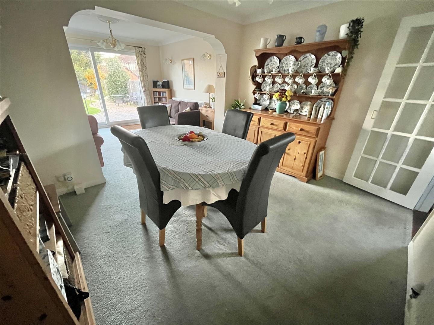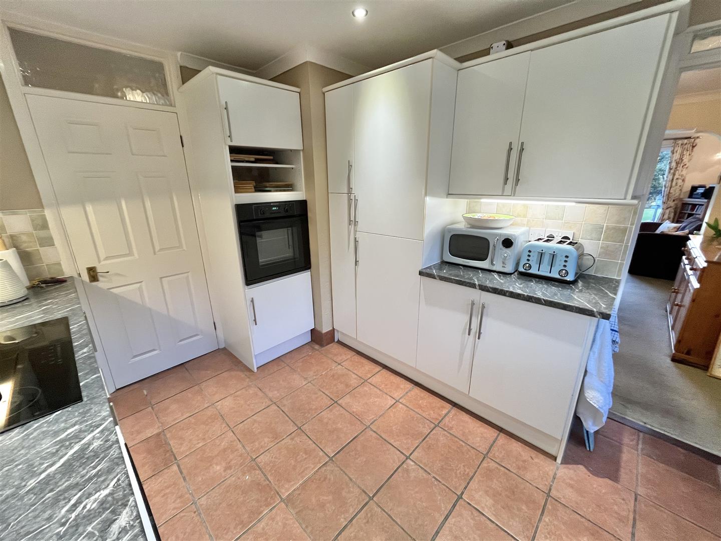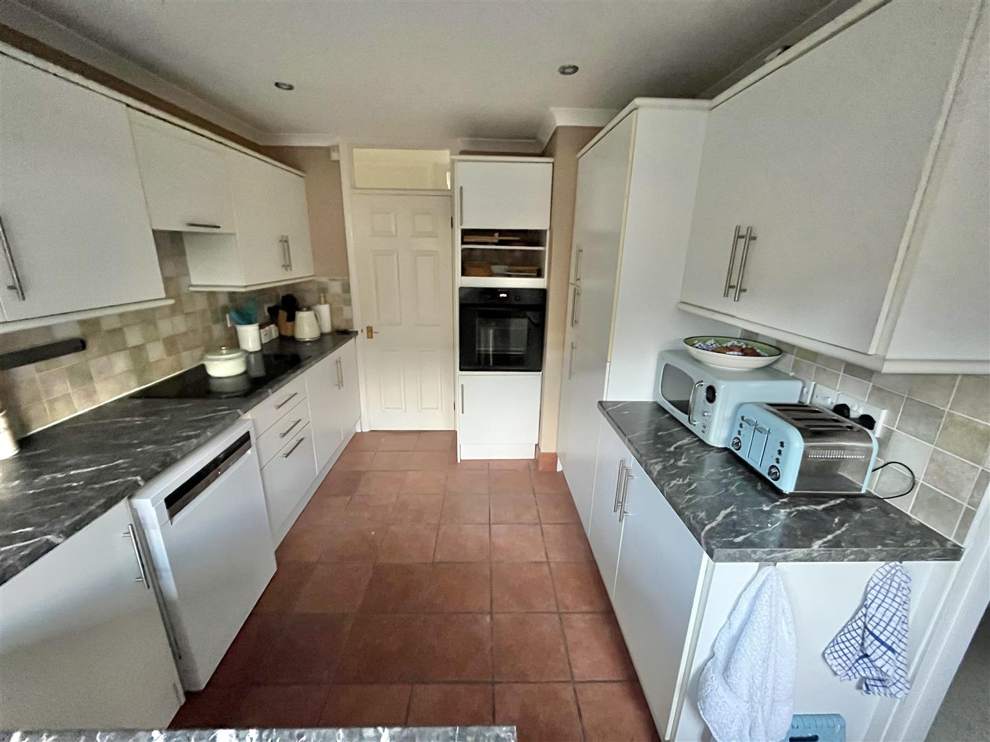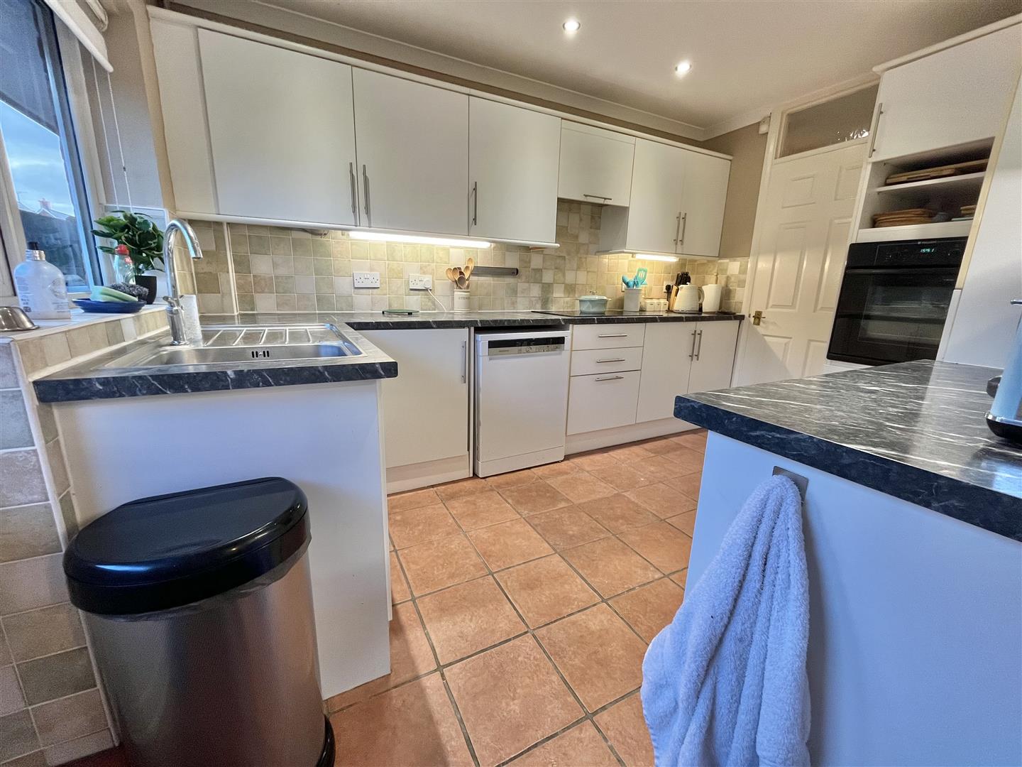 Fitted with a range of white fronted units with marble effect rolled edge work surfaces with cupboards and drawers below. Inset single drainer stainless steel sink unit with mixer tap. Inset five ring electric hob with extractor hood above (not tested). Integrated fridge. Inset oven (not tested). Space for dishwasher. Space and plumbing behind cupboard for washing machine. Double glazed window to side. Double glazed door leading to garden.