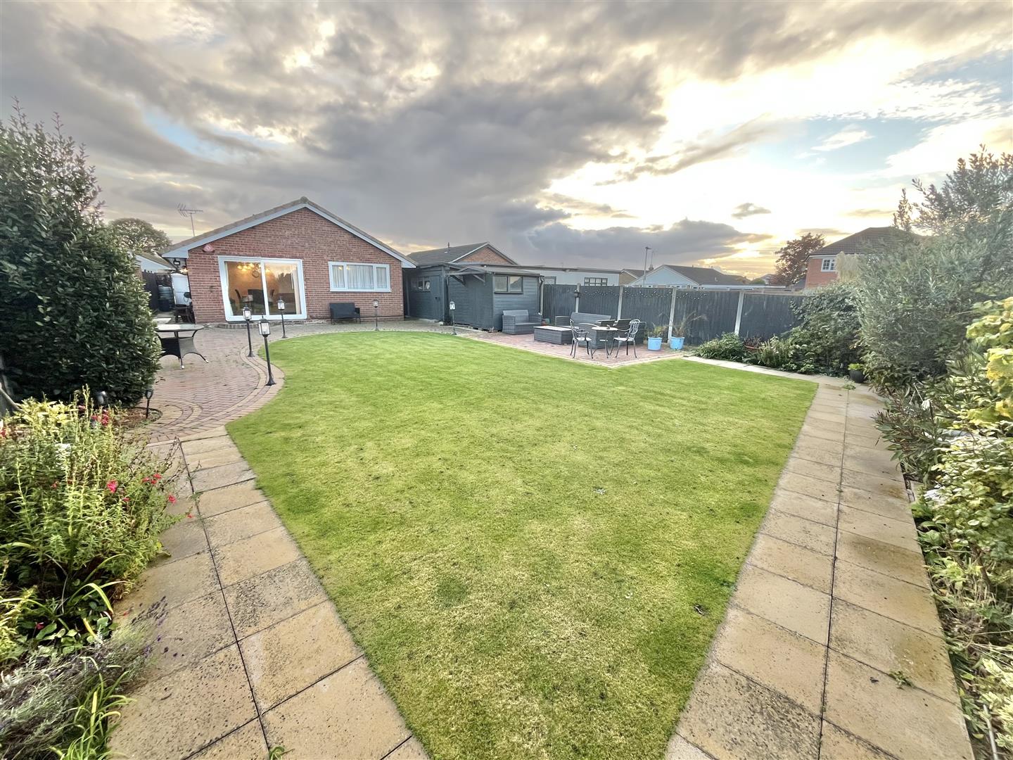 Majority patio paved garden with the rest being laid to lawn. Two storage sheds. Side access on both sides. Access to garage.